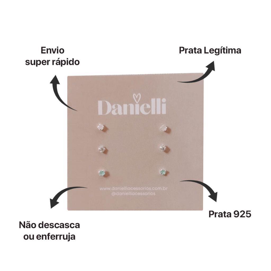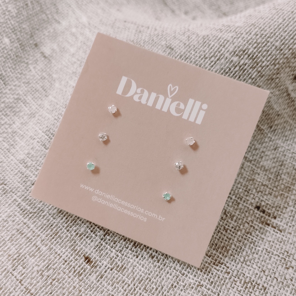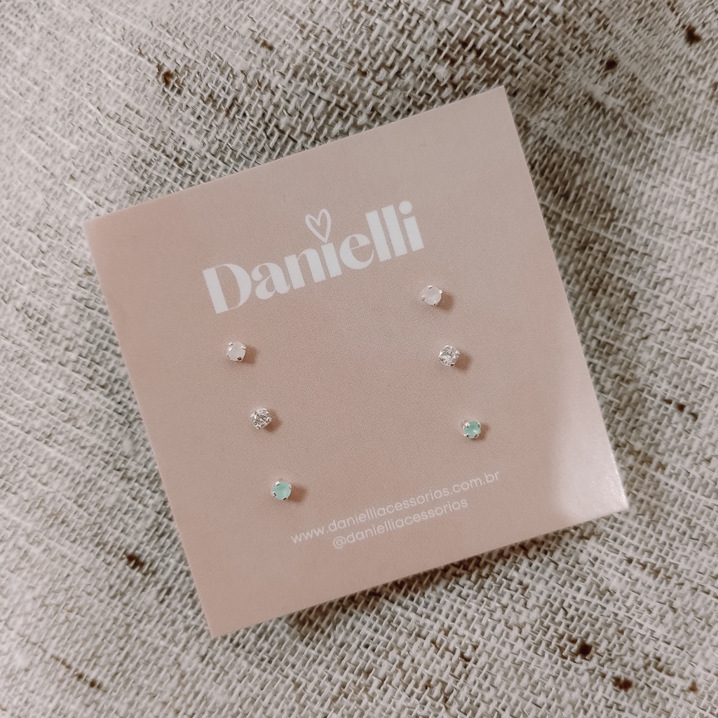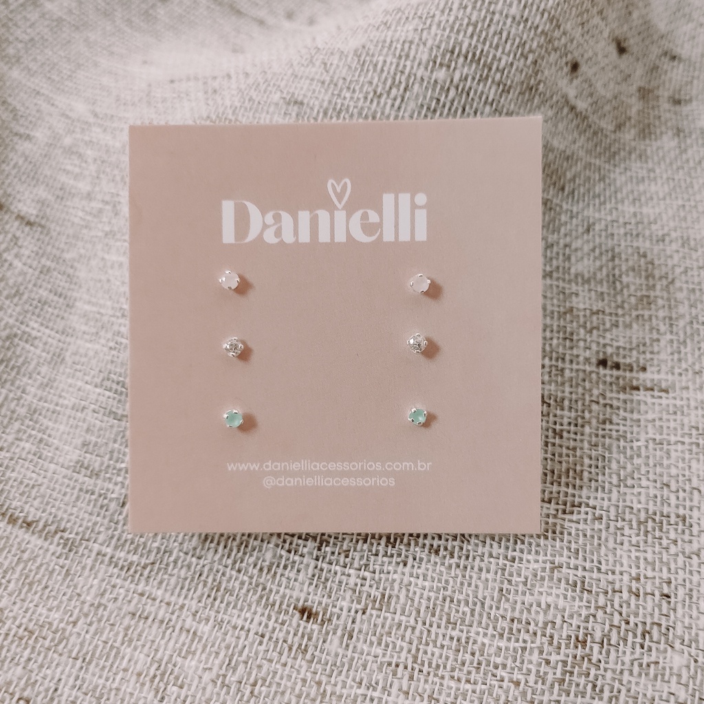 Trio de Brincos Prata 925 Zircônias Redonda Rosa Leitoso - Azul Leitoso - Cristal | 2 mm