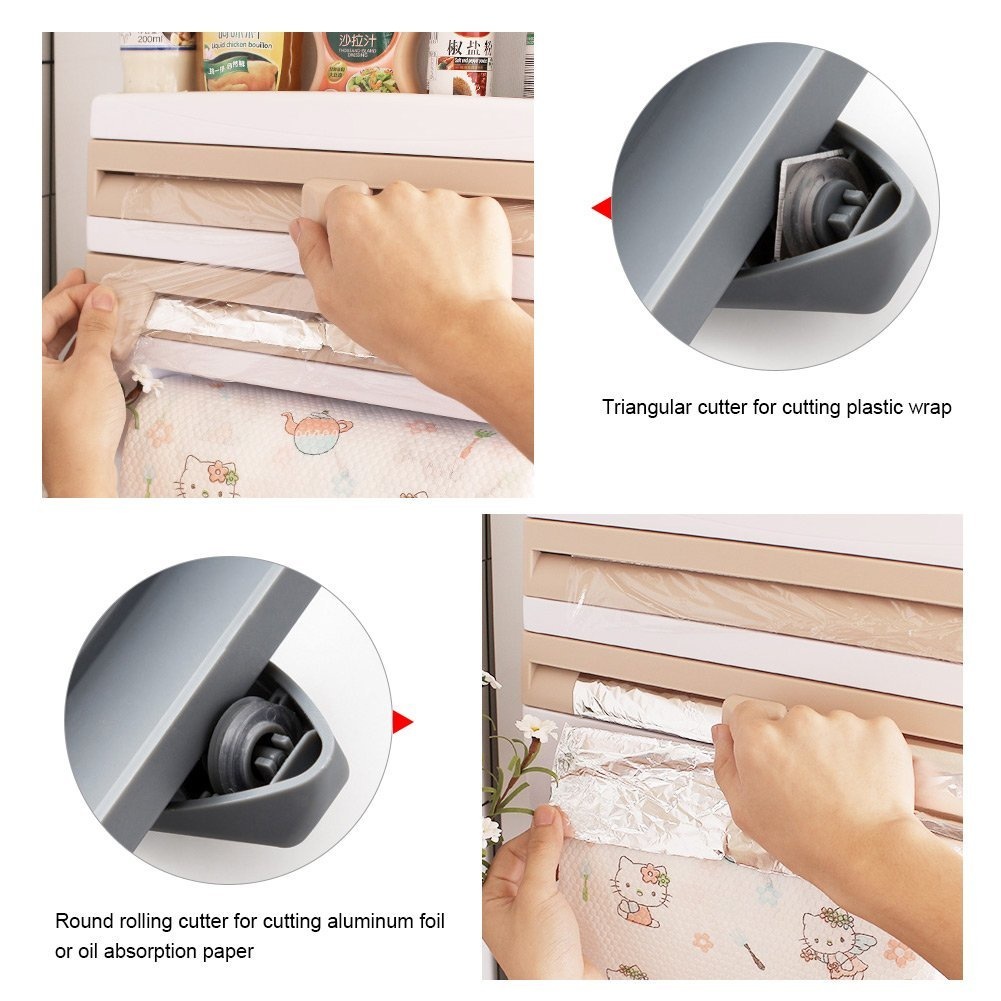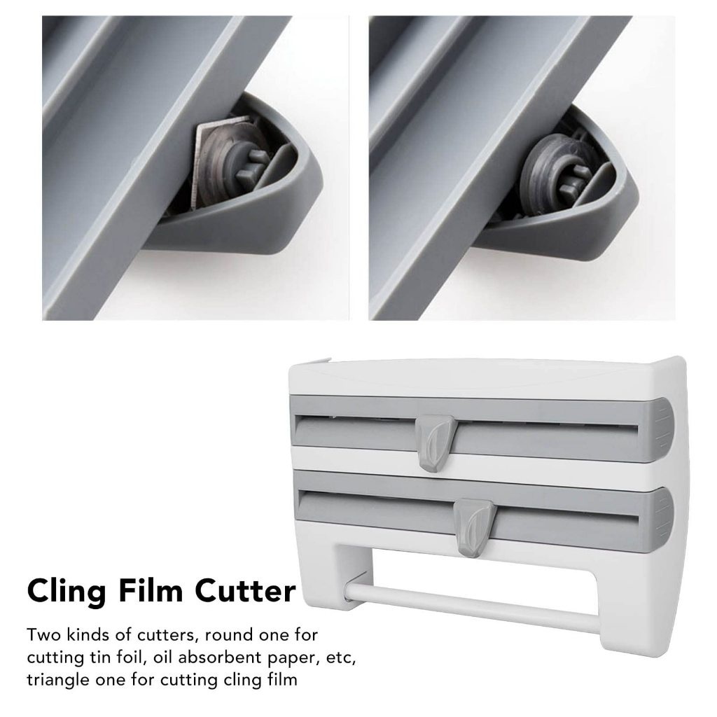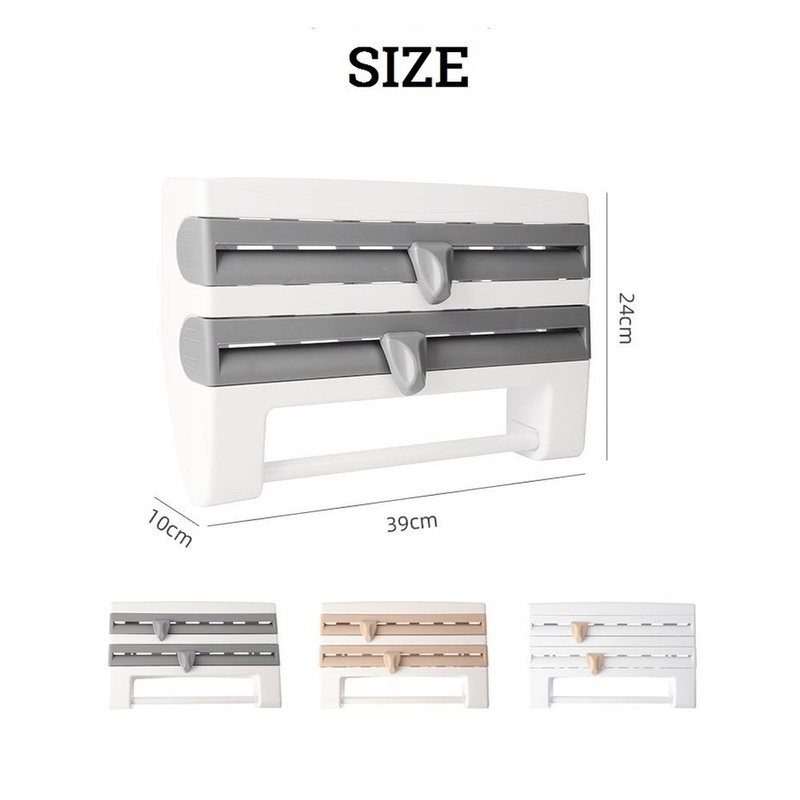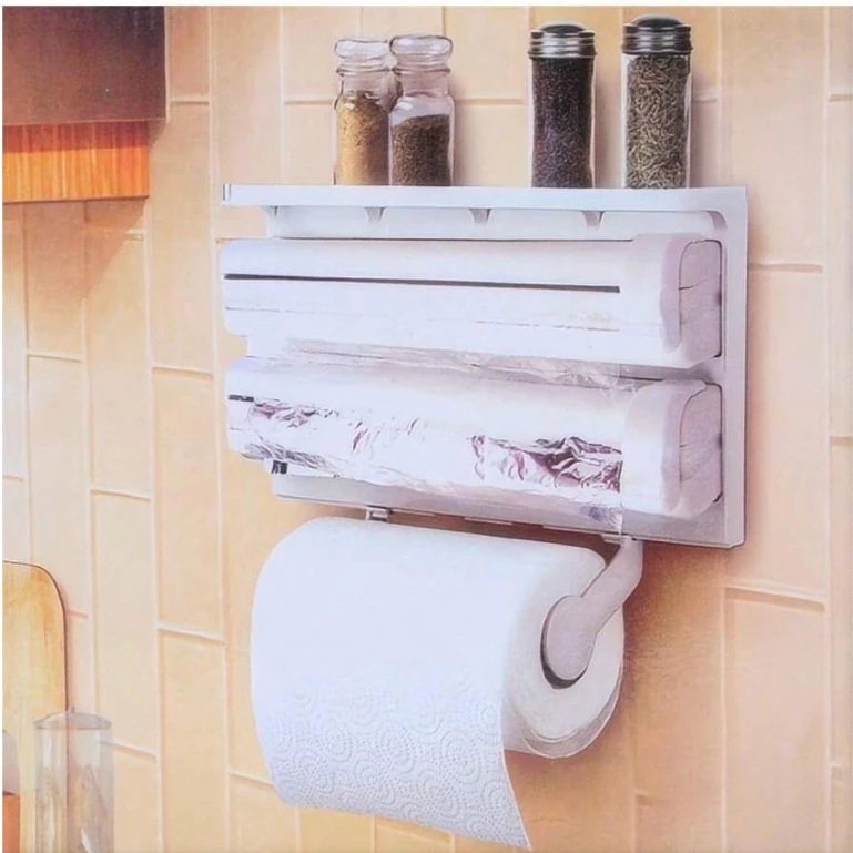 Dispenser 4 em 1 Cortador Papel Filme Aluminio Porta Papel Toalha Tempero Organizador de Cozinha