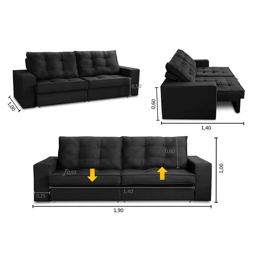 Sofá Retrátil e Reclinável 2 lugares 1,90m com Molas Marcela Suede Preto Adonai Estofados