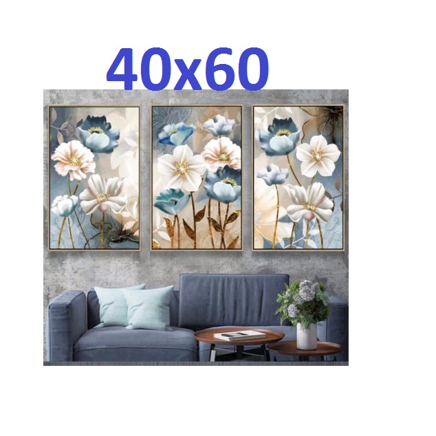 Quadros Decorativos 3 peças Pintura Flores Azul e Branca 40x60
