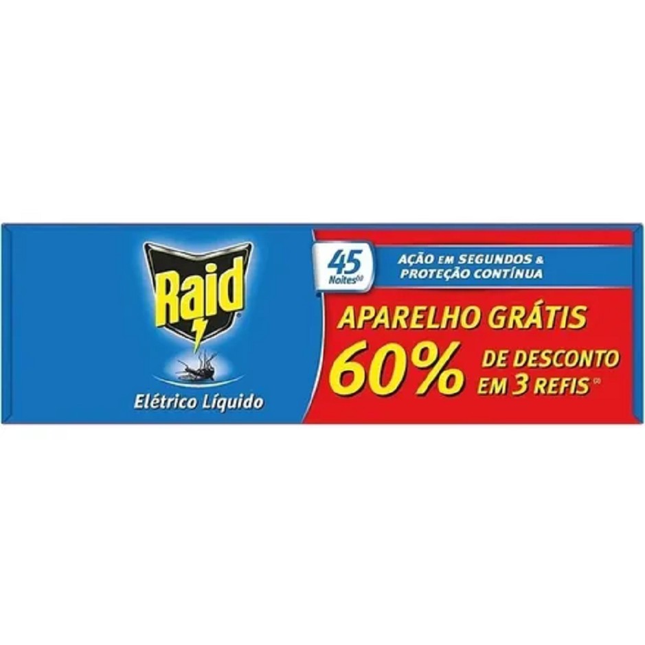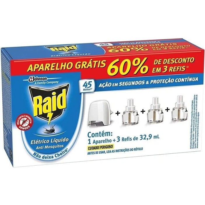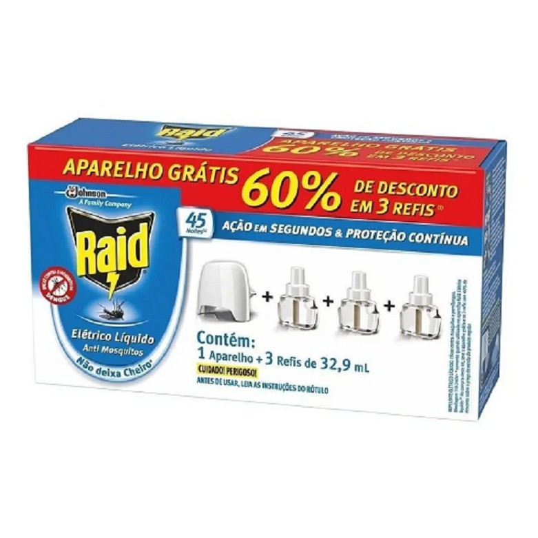 Repelente Elétrico Raid Tomada Líquido 45 Noite 3 Refis