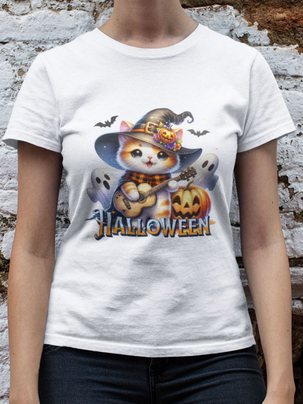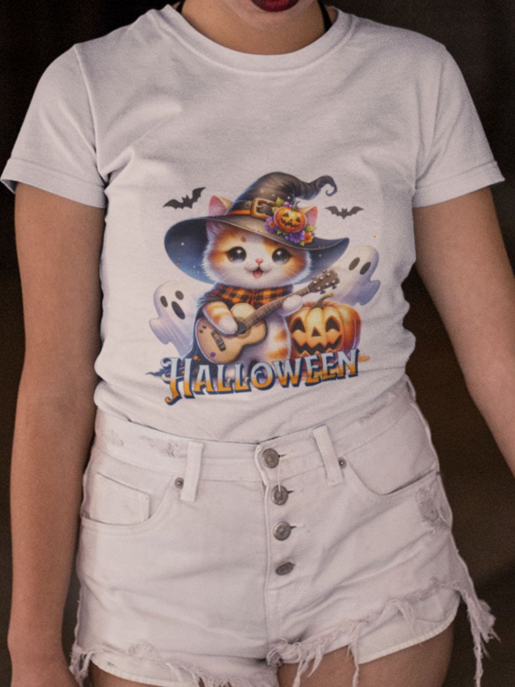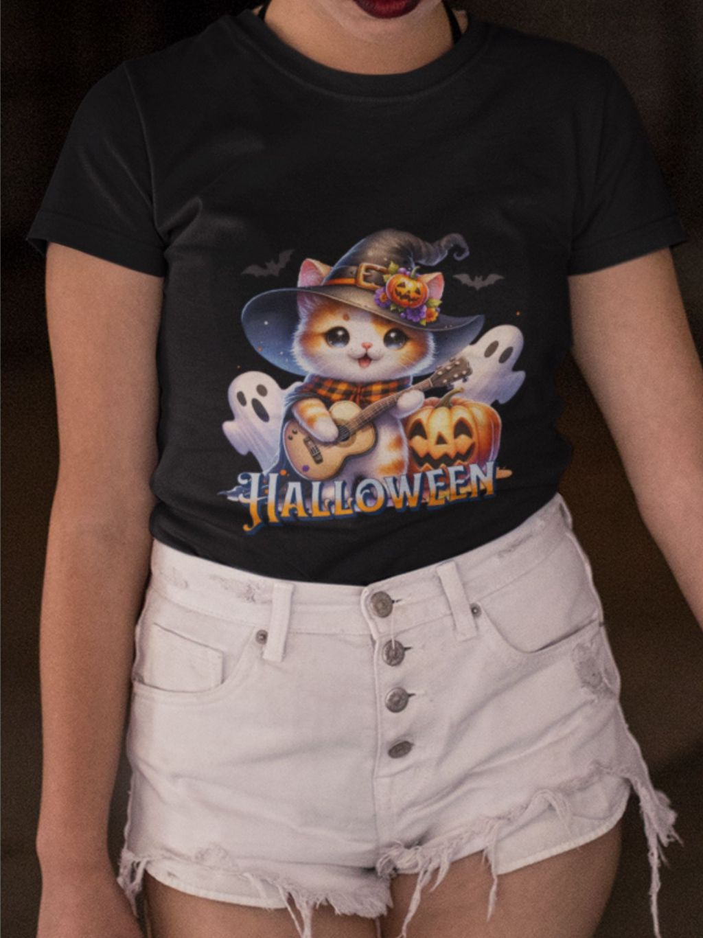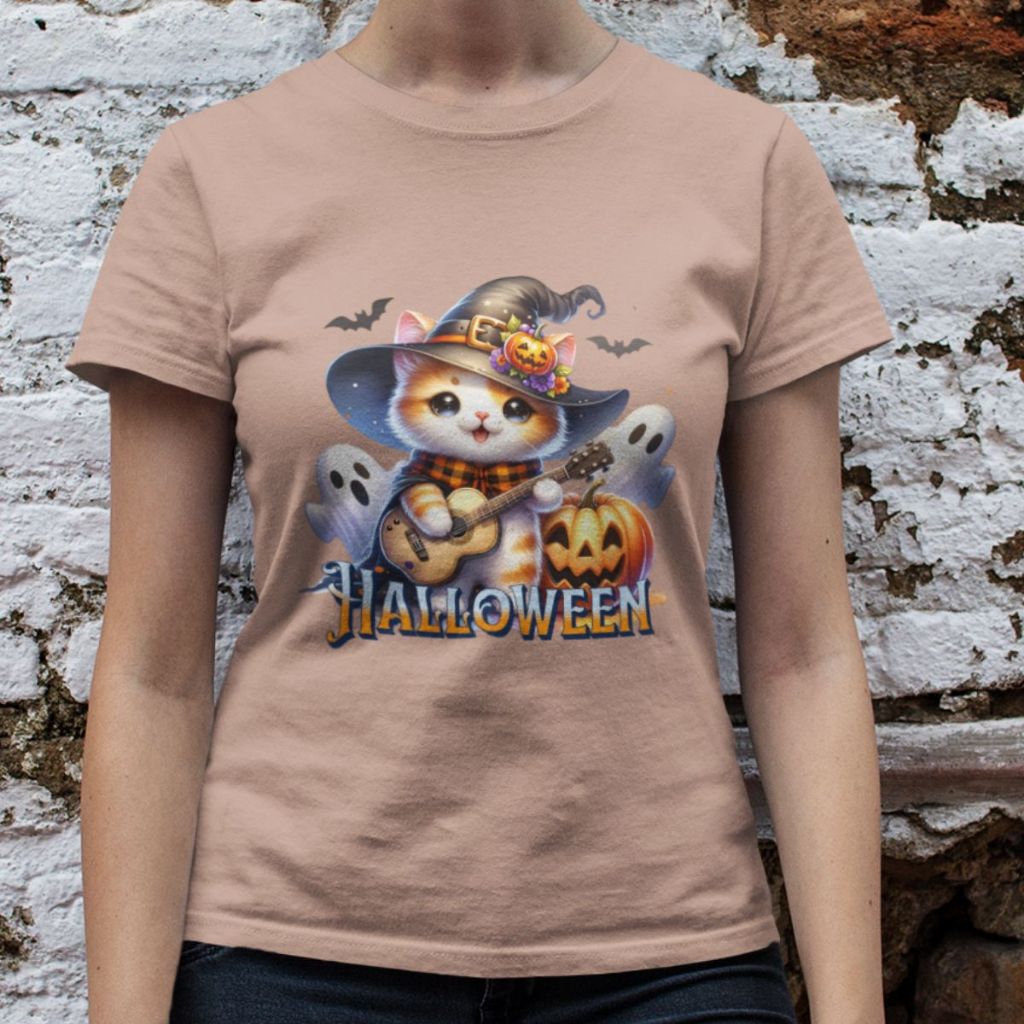 Camiseta Feminina GuGi Algodão Premium T-shirt Baby Look Estampa Cartoon Gato Halloween Plus Size