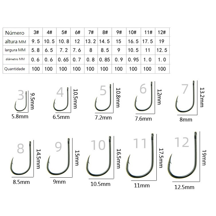 Kit 100 Anzóis Aço Carbono #3 ao #12 com Caixa Organizadora para Pesca