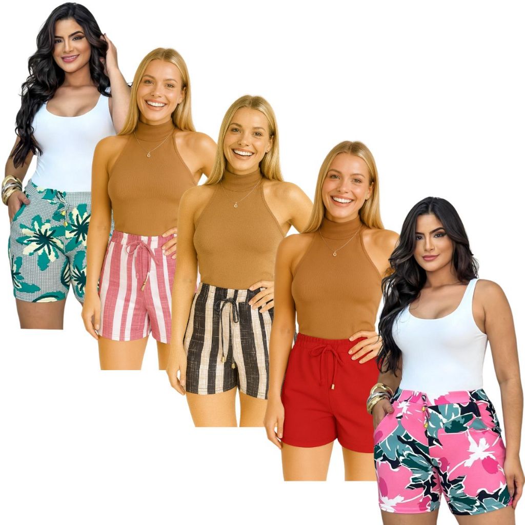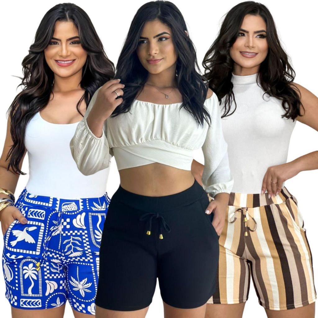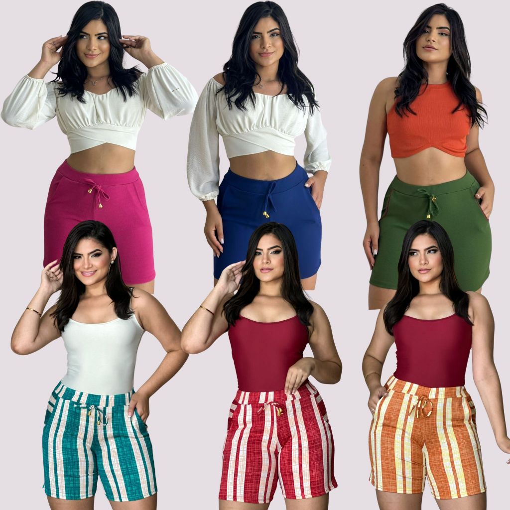 Shorts malha crepe feminino liso listrado floral cores variadas kit combo