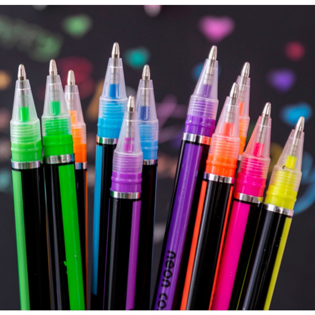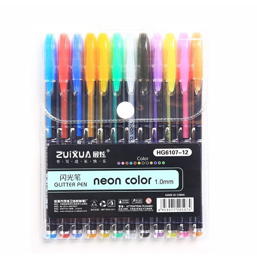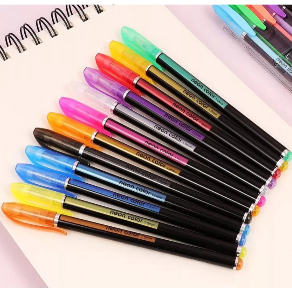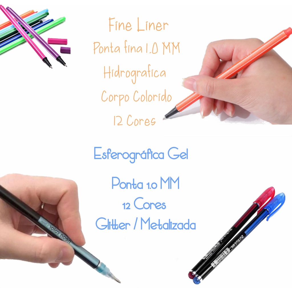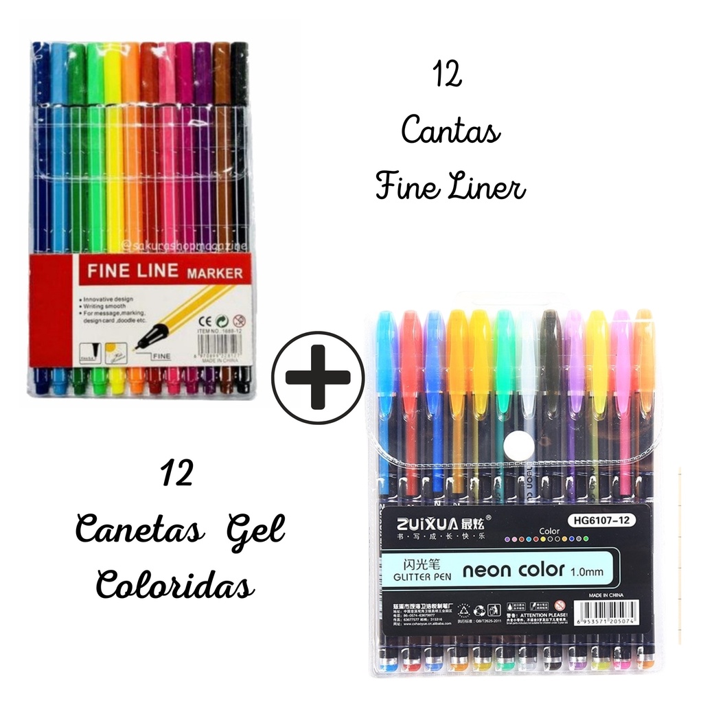 Kit 12 Canetas Coloridas Fineline Ponta Fina 0.4mm + 12 Canetas Esferográficas Gel Coloridas Glitter Ponta 1.0mm