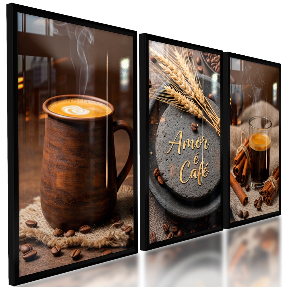 Quadros Decorativos Kit 3pçs Café Cantinho Amor Luxo Espaço Trigo Cafeteria Moderno
