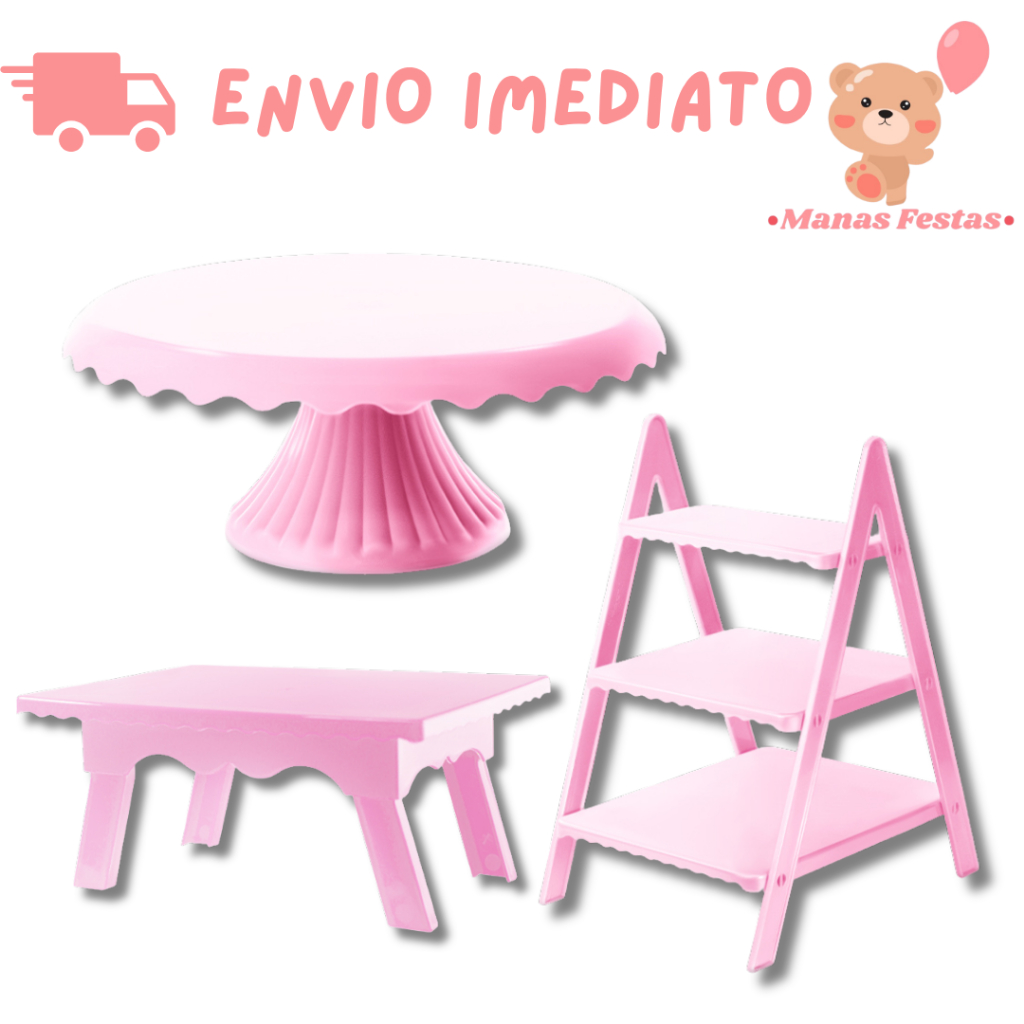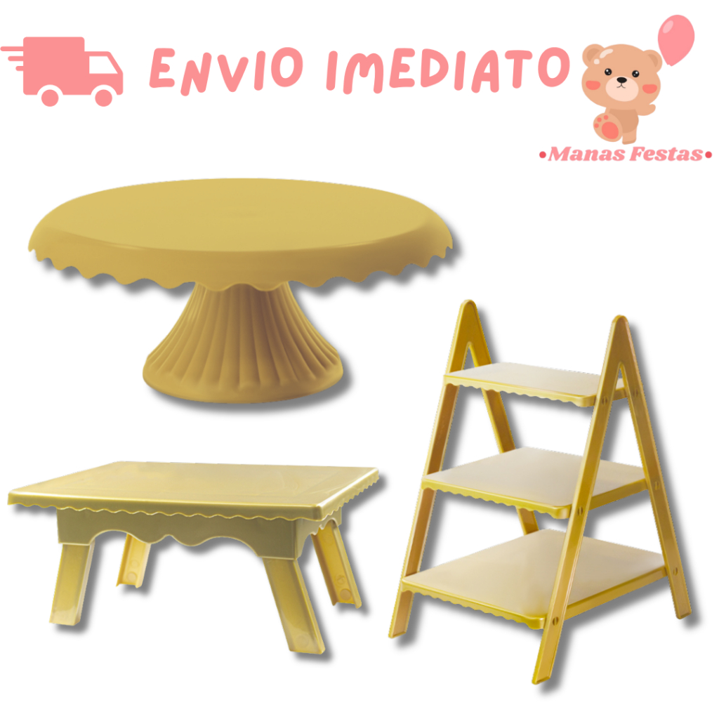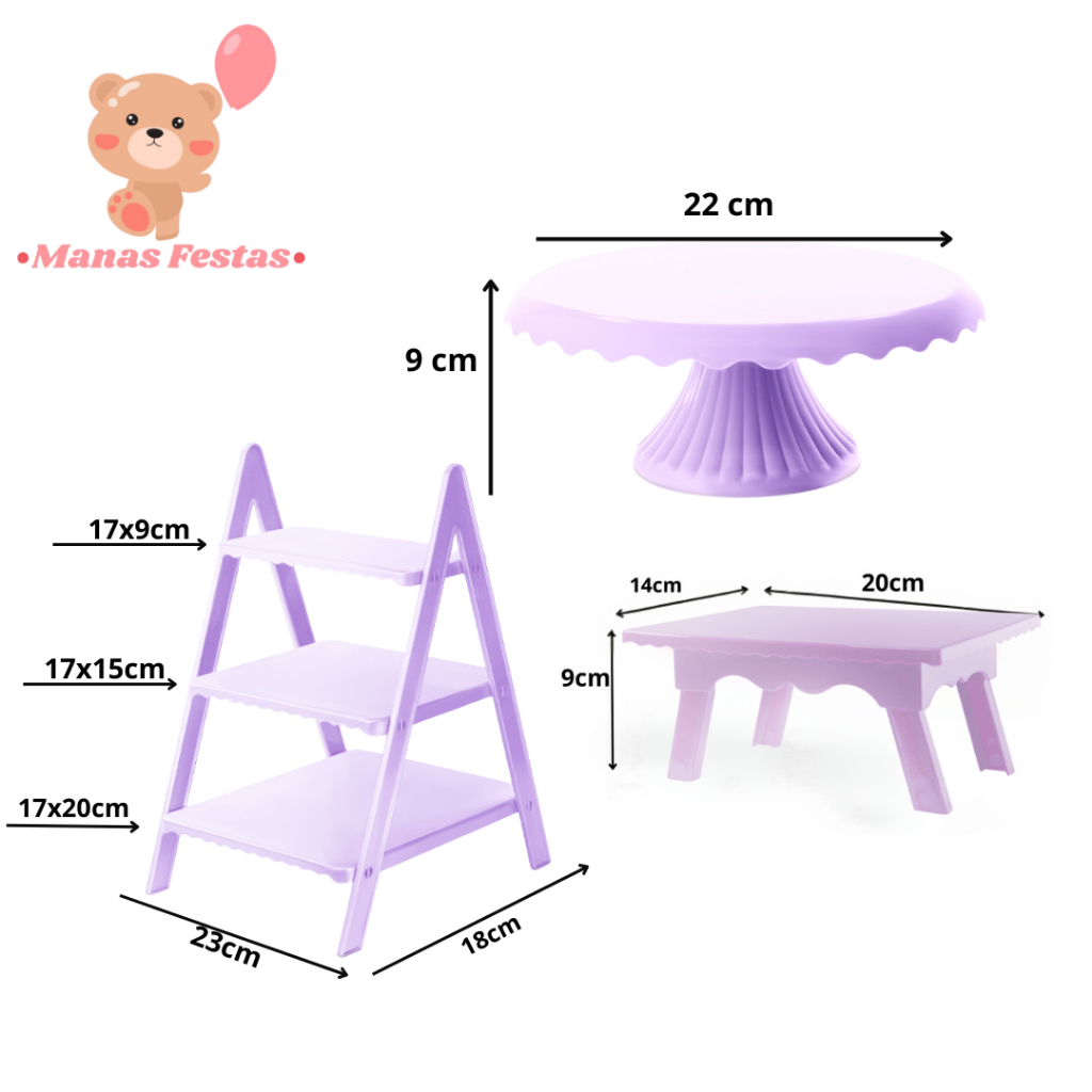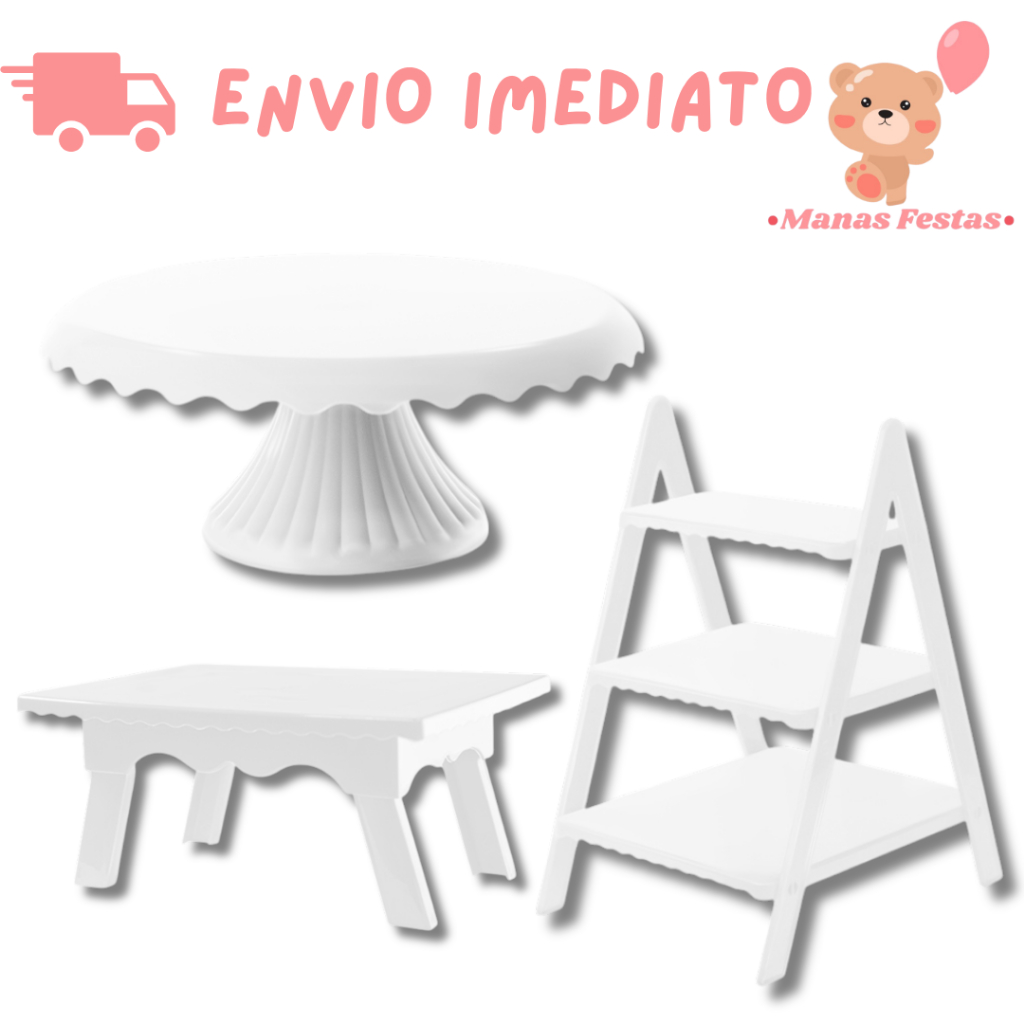 Kit Luxo Simplificado com Boleira Cake Renda 22cm + 1 Mesinha + 1 Escadinha Decorativa (3 Peças)(+5 Cores)