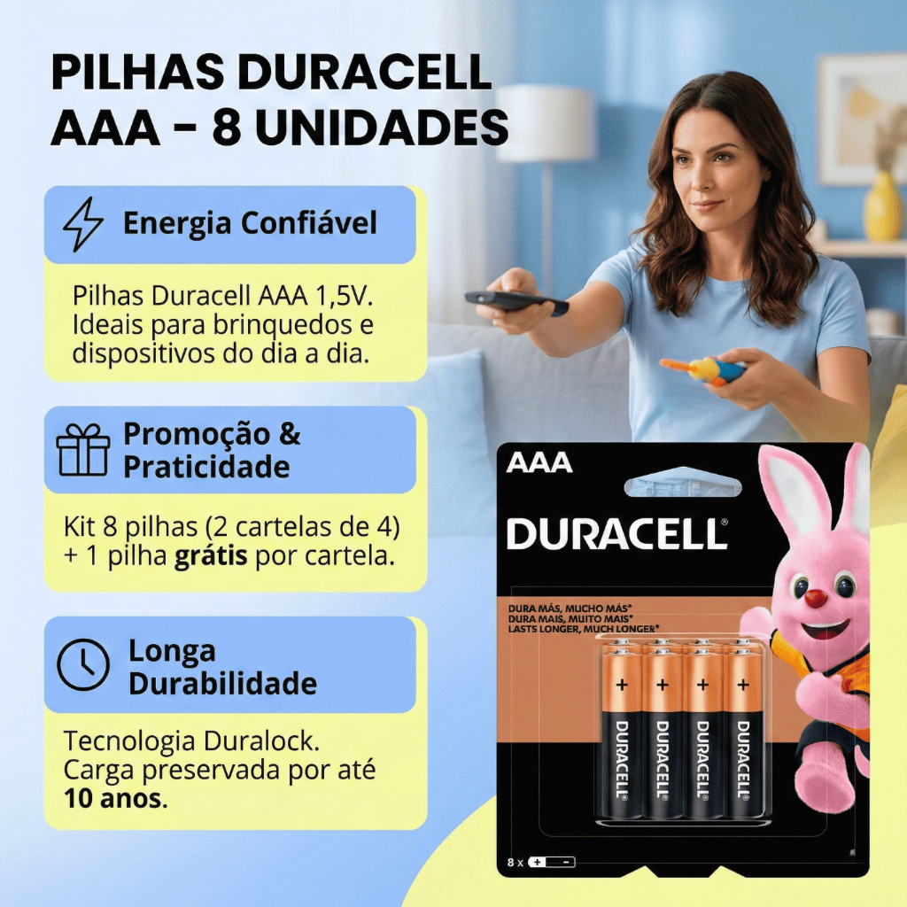 Kit 8 Pilhas Duracell Palito AAA - 2 cartelas c/ 4 unidades cada