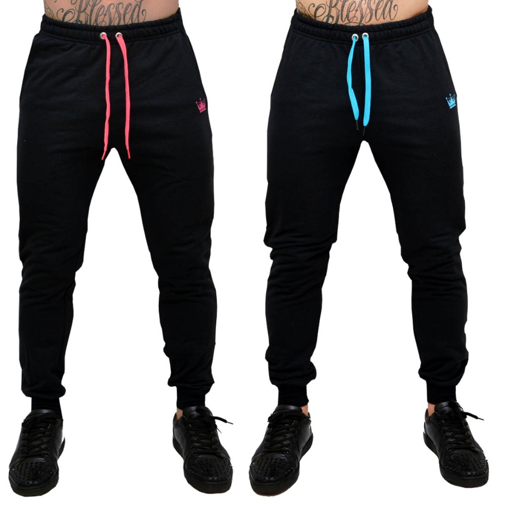 Kit 2 Calças Moletom Masculina Skinny Peluciada Academia Bolsos e Punho Preto Cordão Colorido