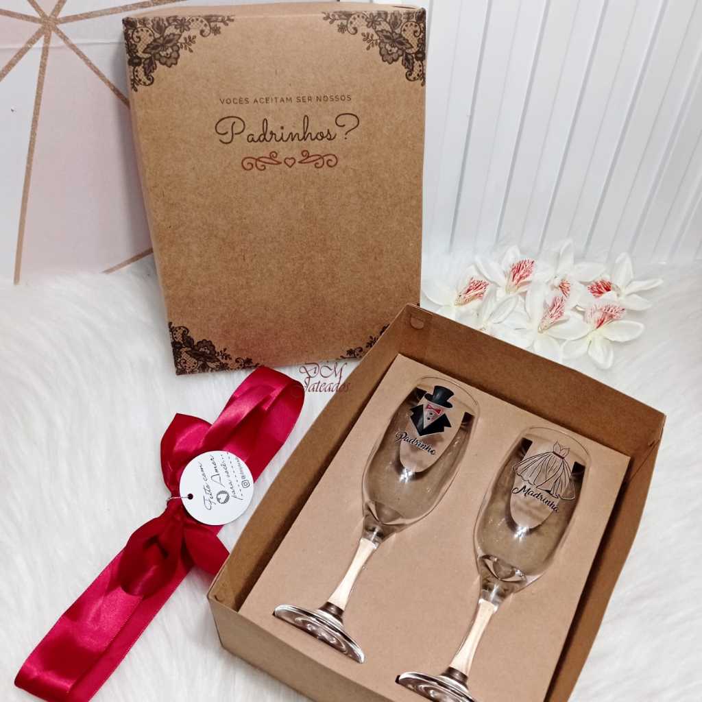 Taça de Champanhe em vidro com caixa presente convite casamento batismo padrinhos e madrinha