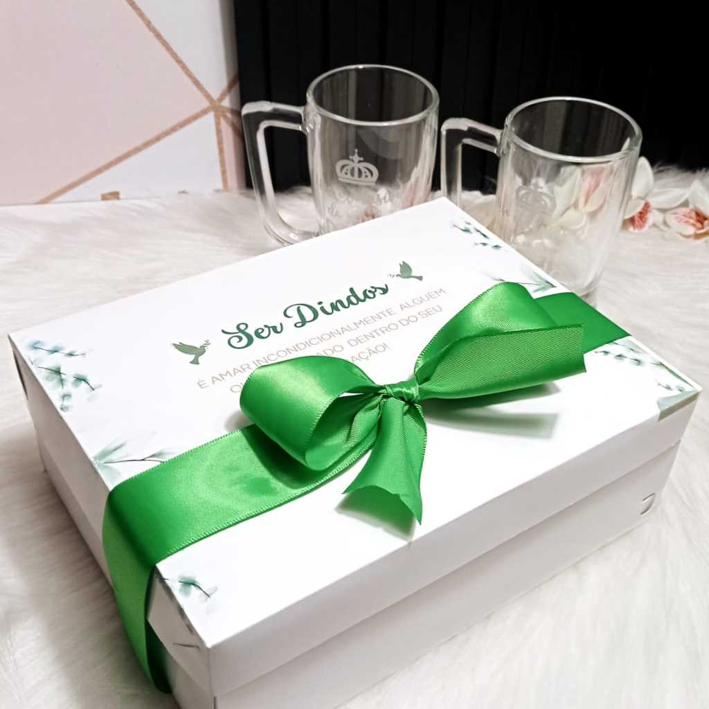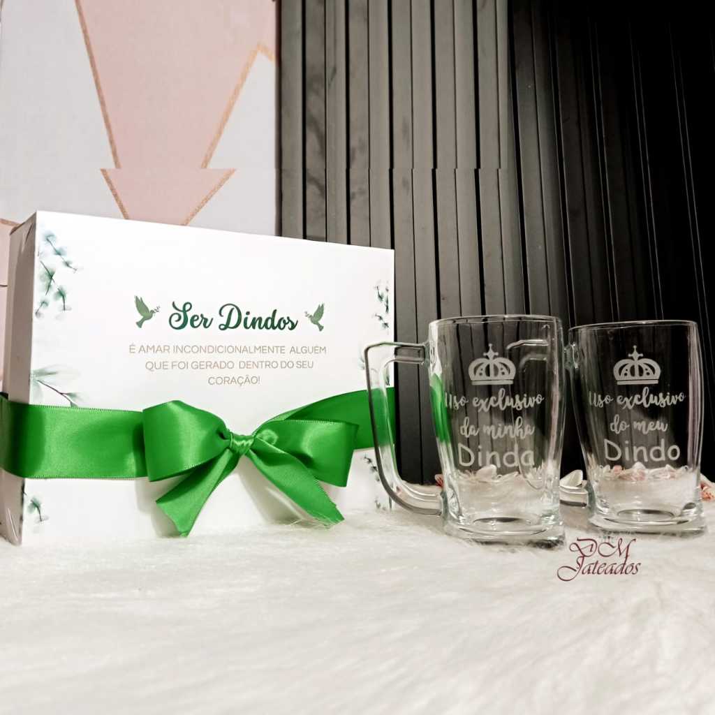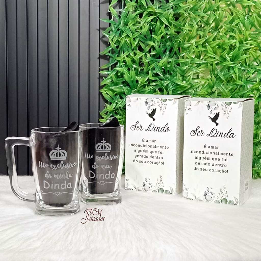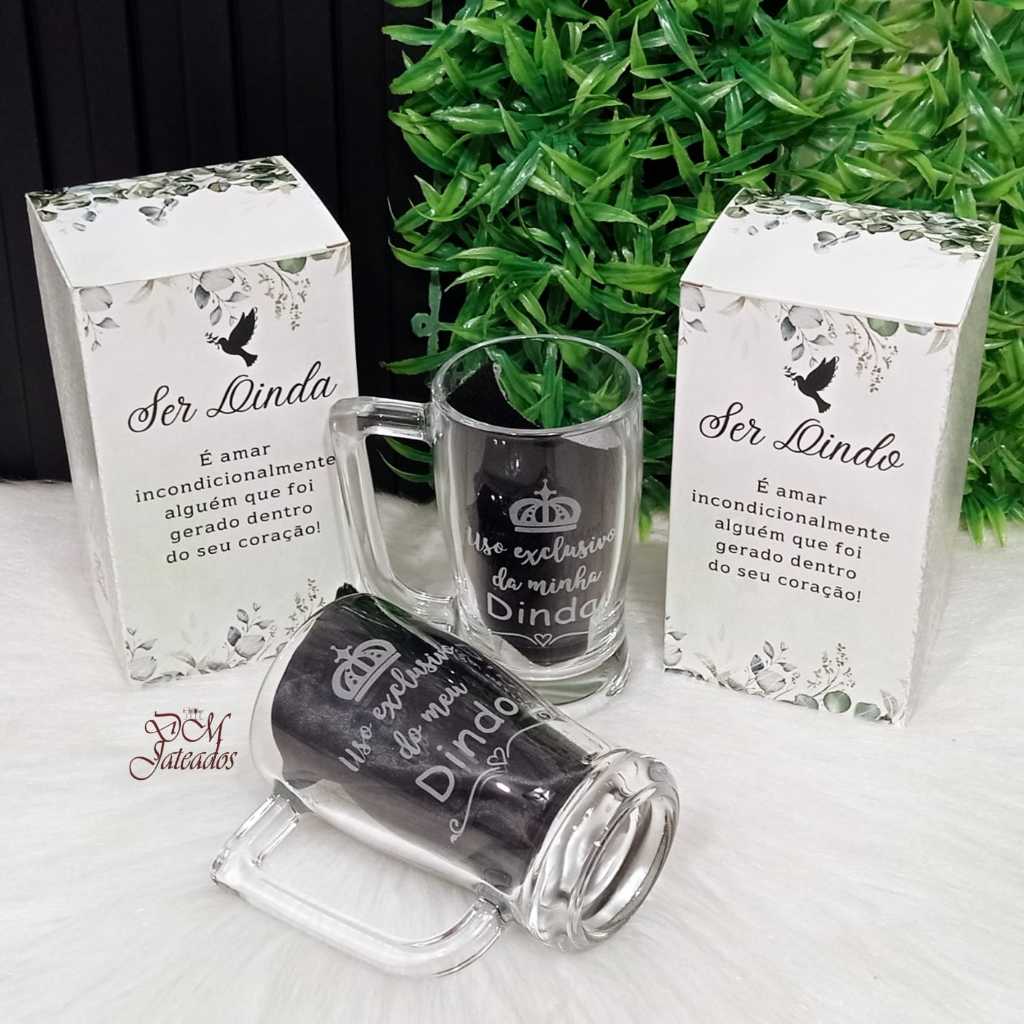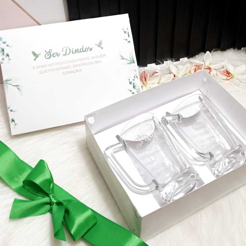 Lembrança Batizado Dindo e Dinda - Caixa + 2 canecas vidro - Casal ou Individual