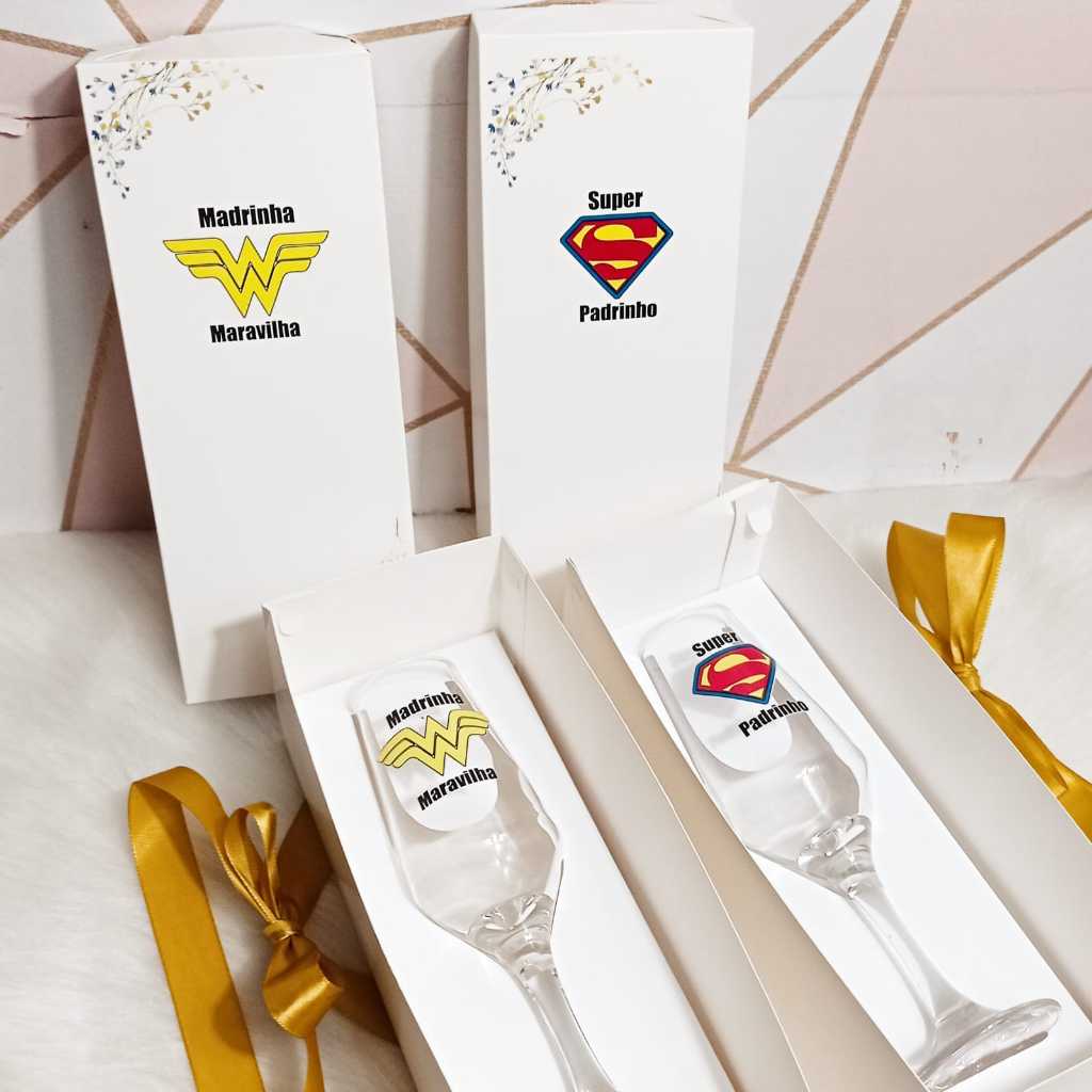 Par De Taças champanhe Individual + Caixa Presente individual - Super padrinho e madrinha Maravilha