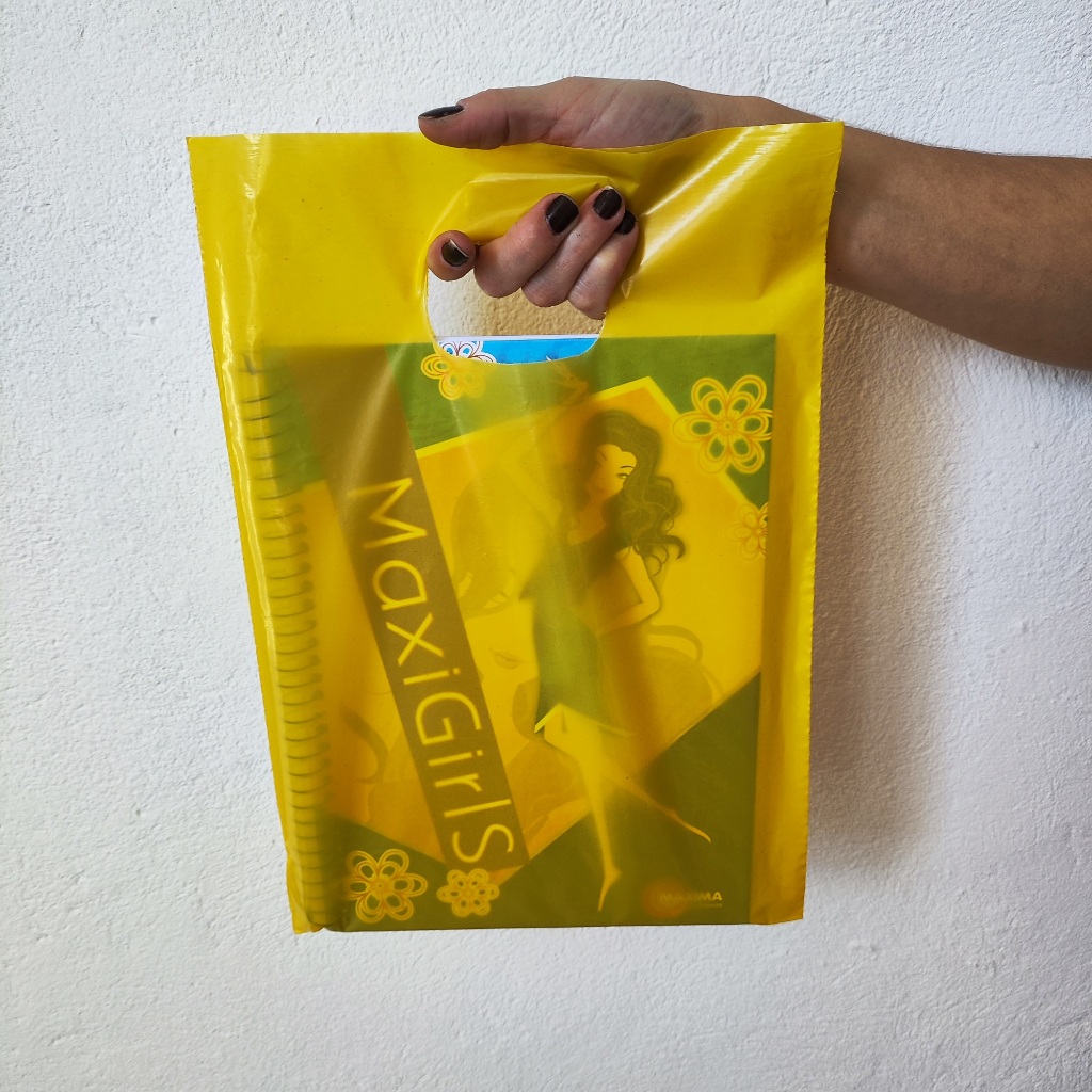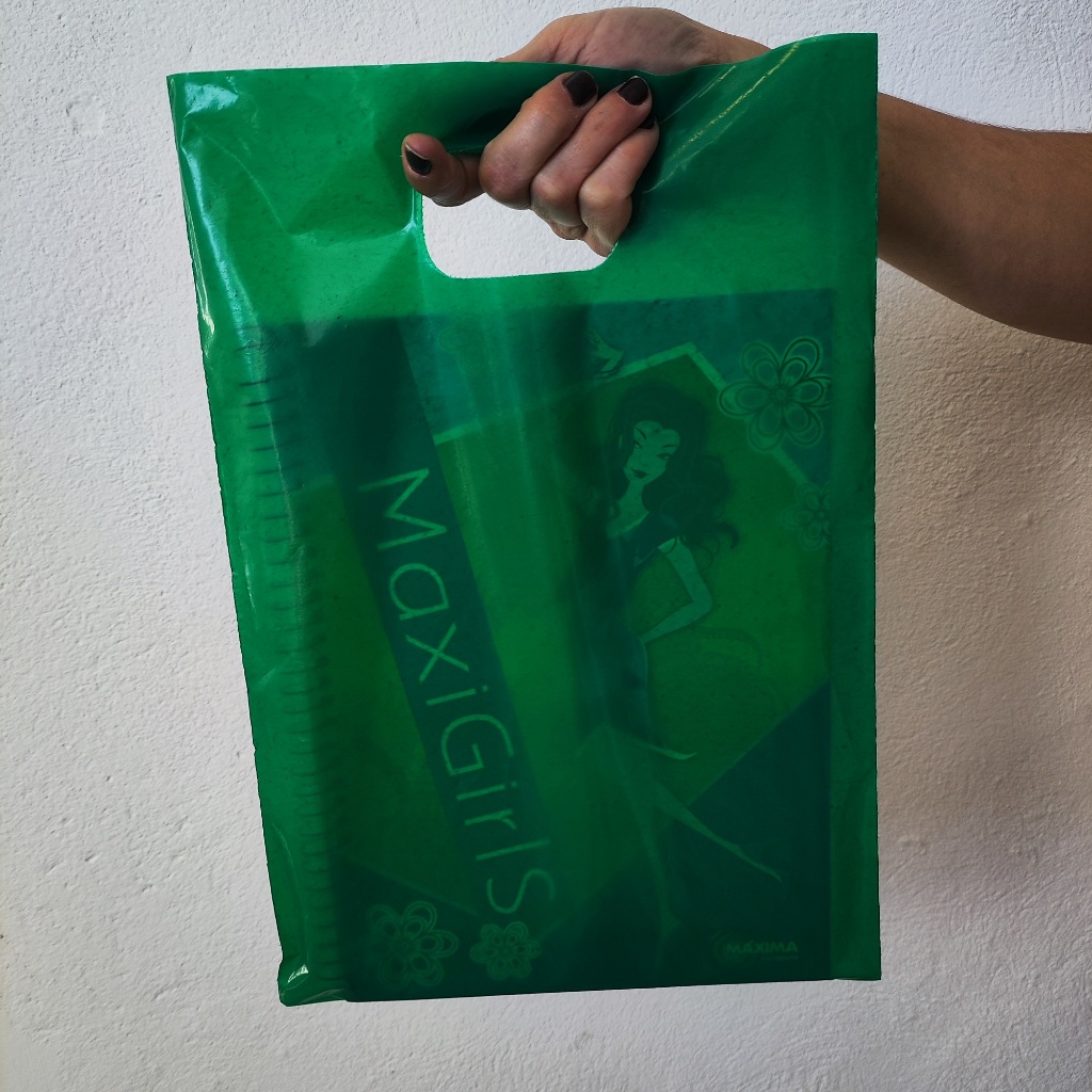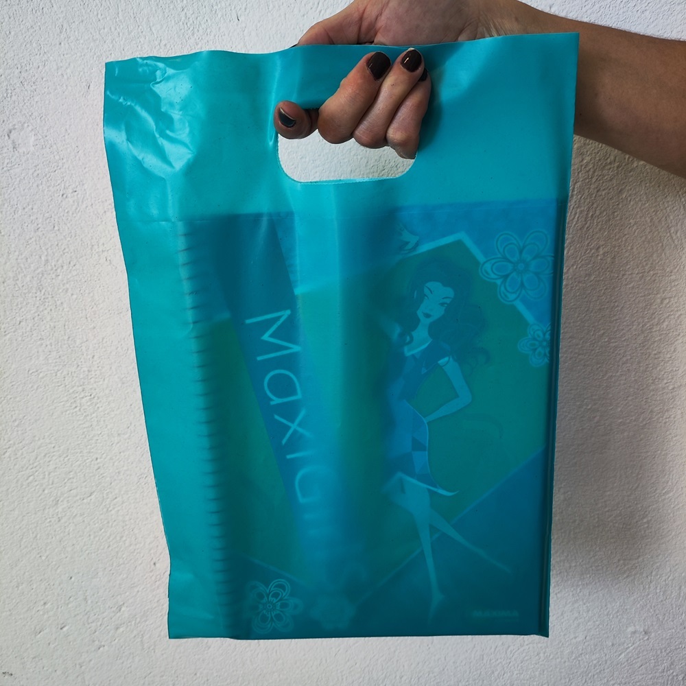 kit com 100 Sacolas Plásticas 25x35 Alça Boca De Palhaço Vazada reta.