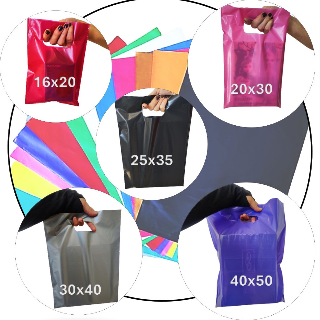 kit 50 Sacolas Plásticas Boca de palhaço vazada tamanhos ; 16x20 , 20x30 , 25x35 , 30x40 e 40x50.