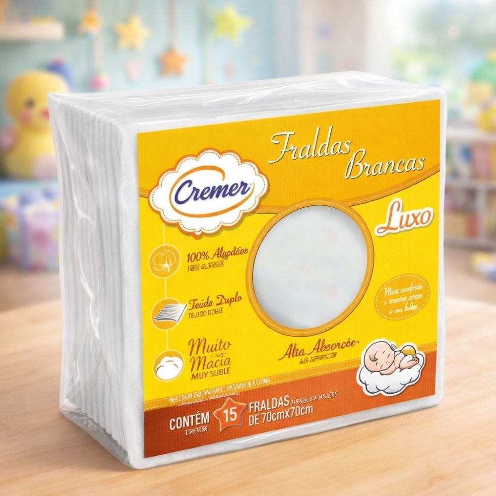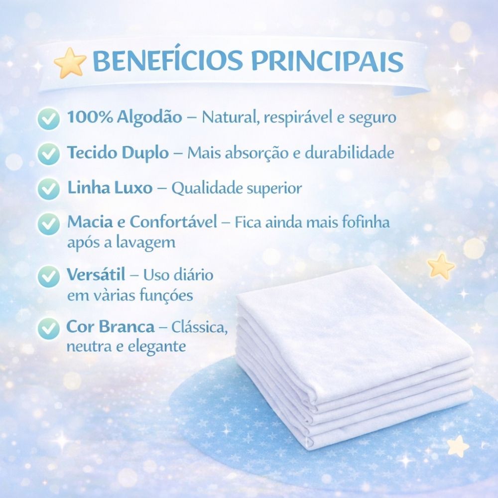 Pacote Fralda Pano Luxo Branco C/bainha Cx/15 Unid. Tamanho 70x70