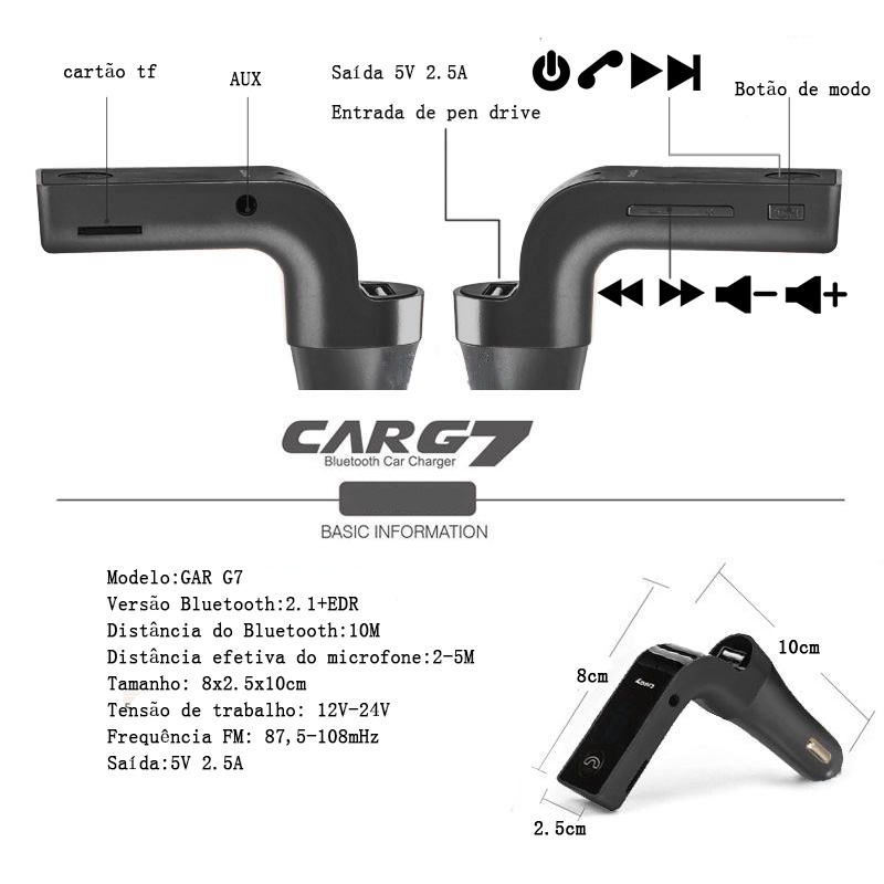 Carregador Automotivo USB G7 FM MP3 Bluethooth
