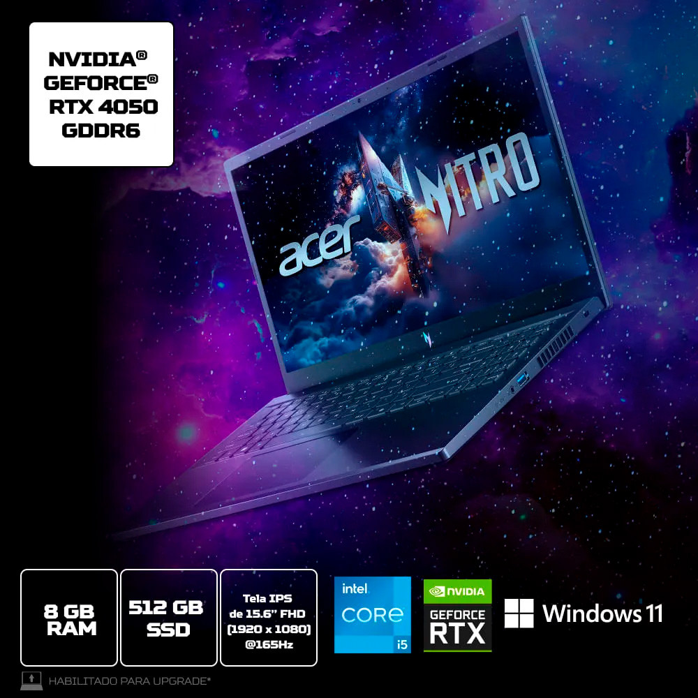 Notebook Gamer Acer Nitro V15 Intel Core i5 13420H 8gb 512gb SSD RTX 4050 Windows 11 Home Tela 15.6" ANV15-52-56PD