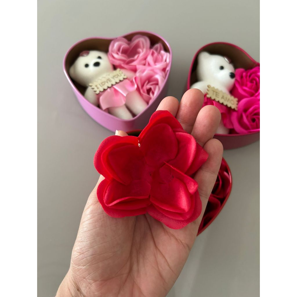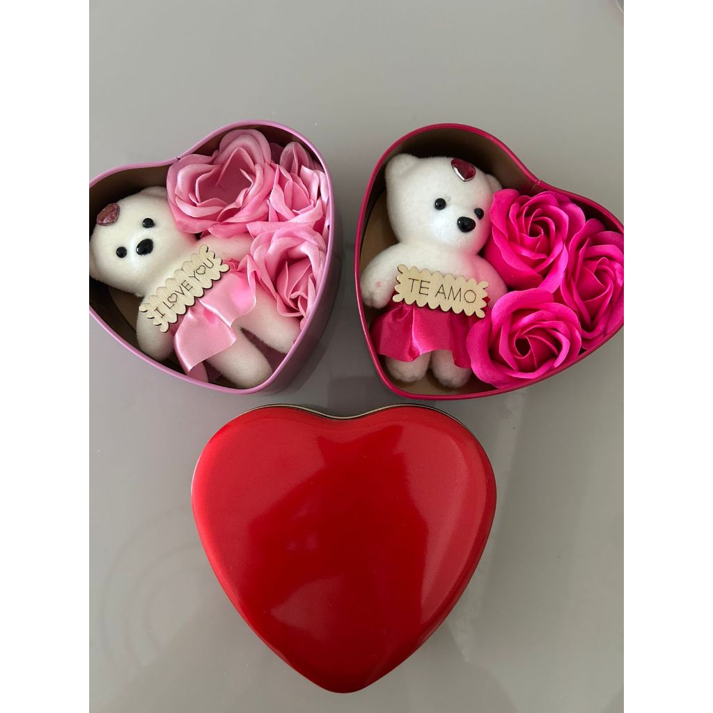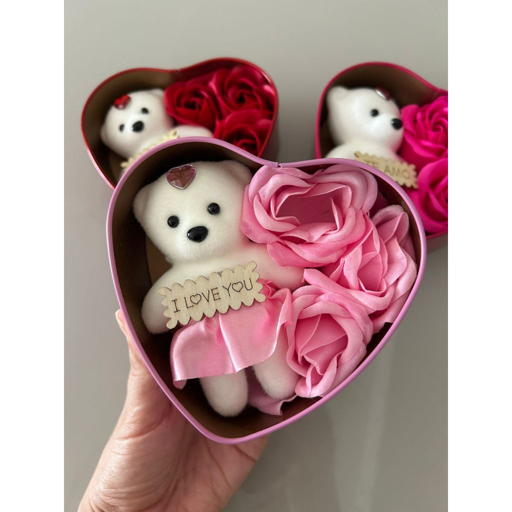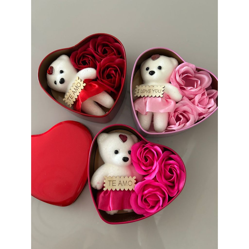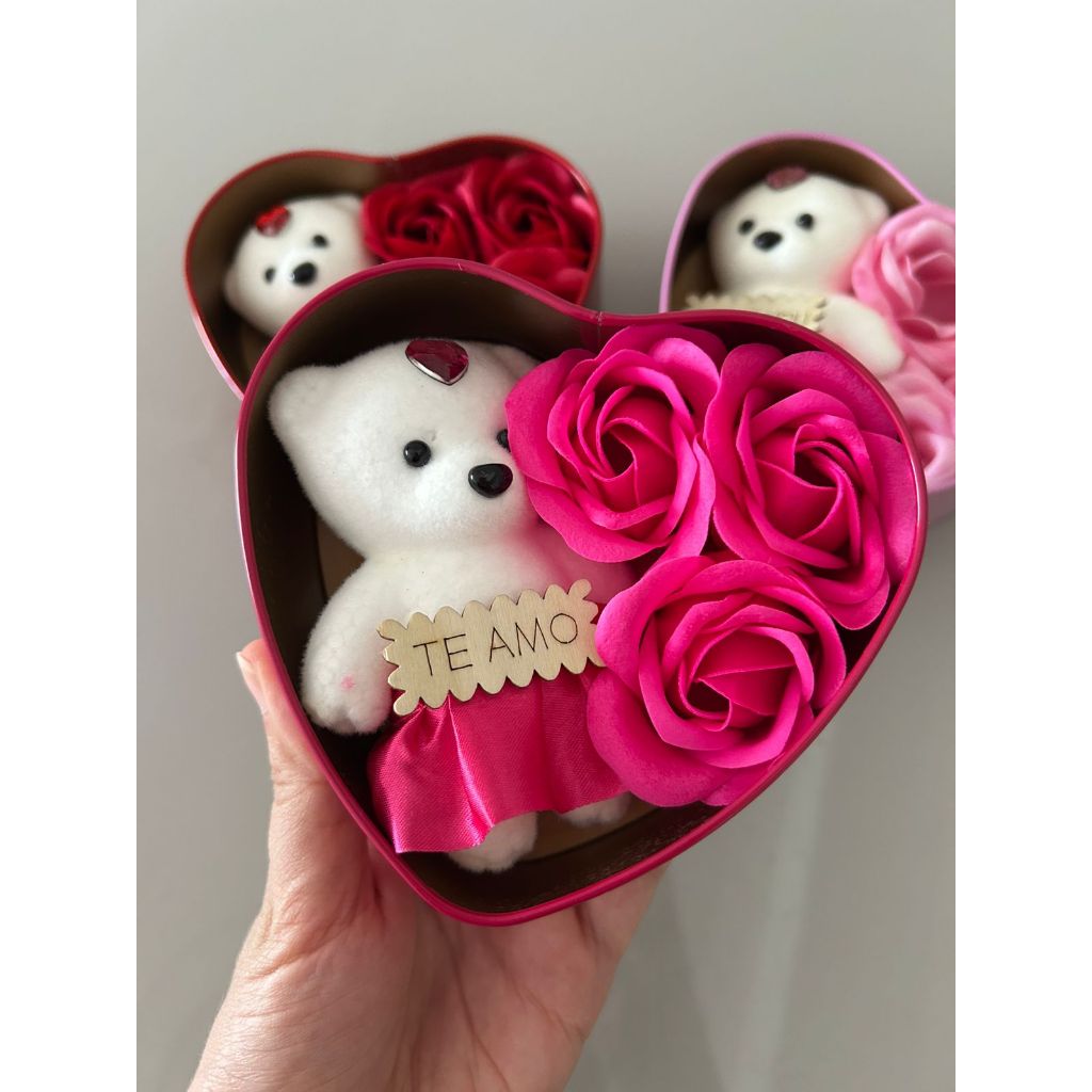 Caixa Coração Com Ursinho e Rosas de Metal Lata Presente Amor