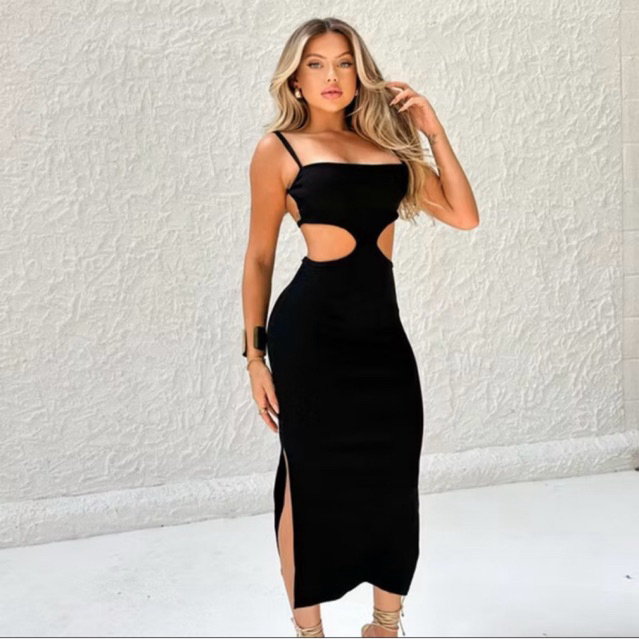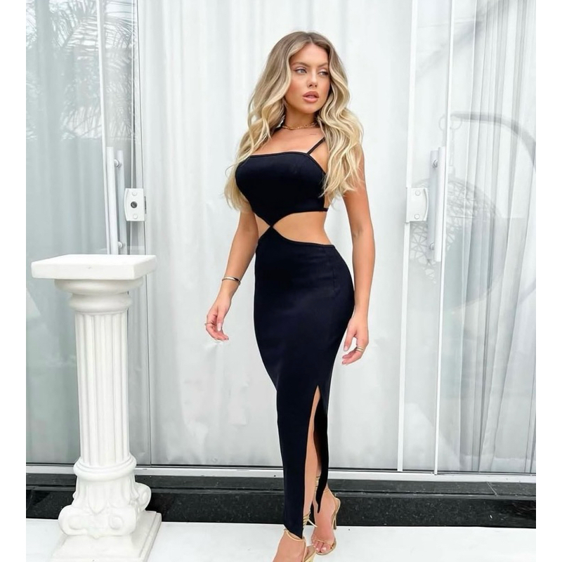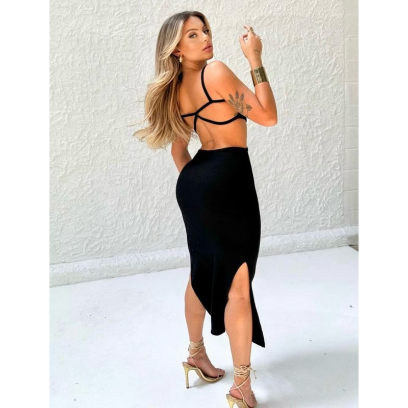 Vestido Midi justo preto fenda lateral ana ruga canelado verão estilo festa