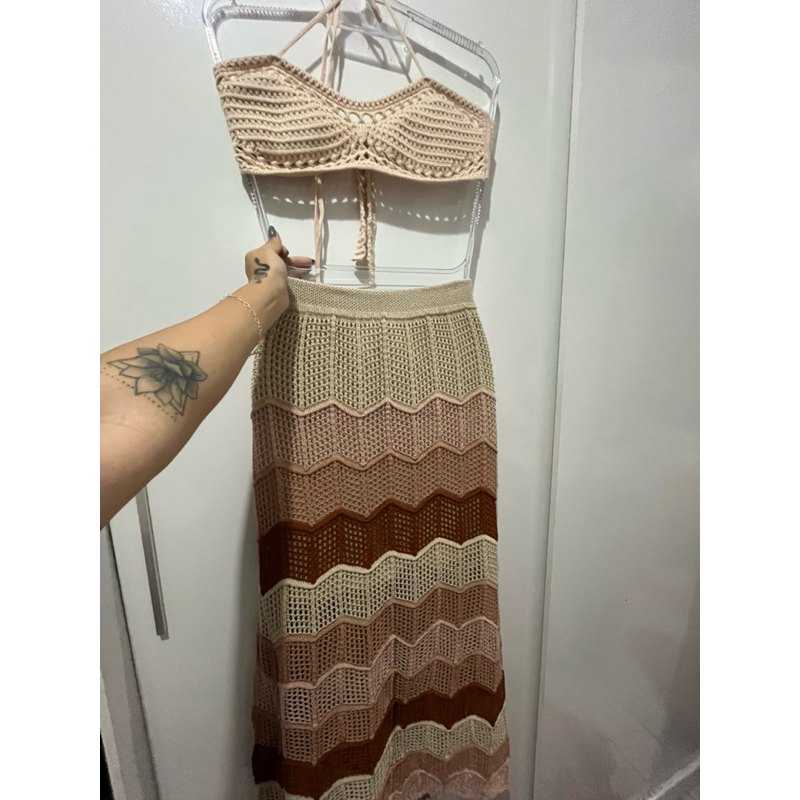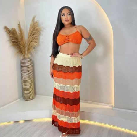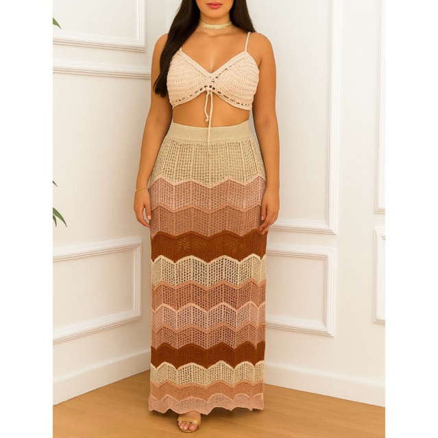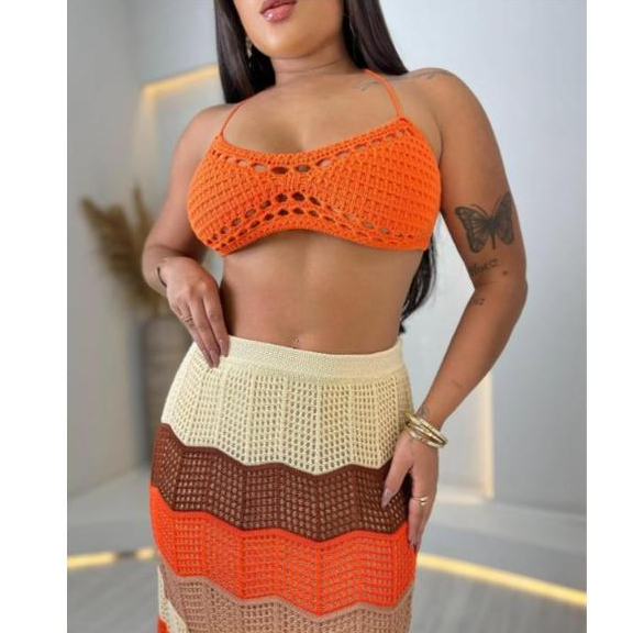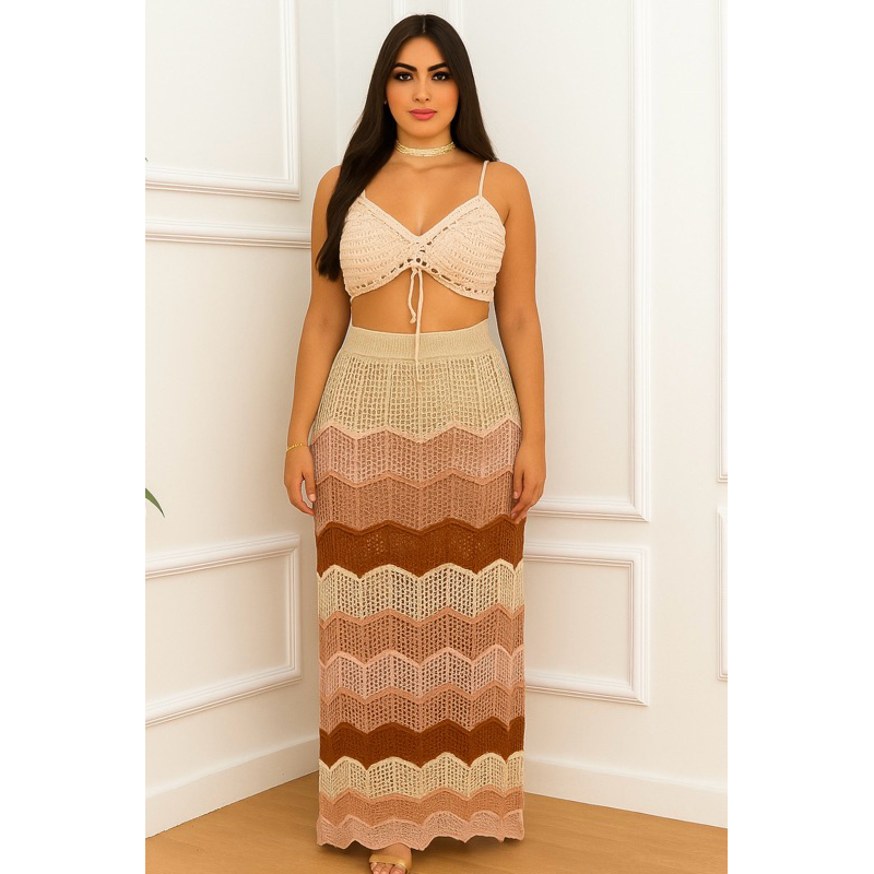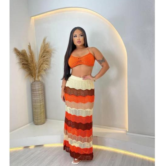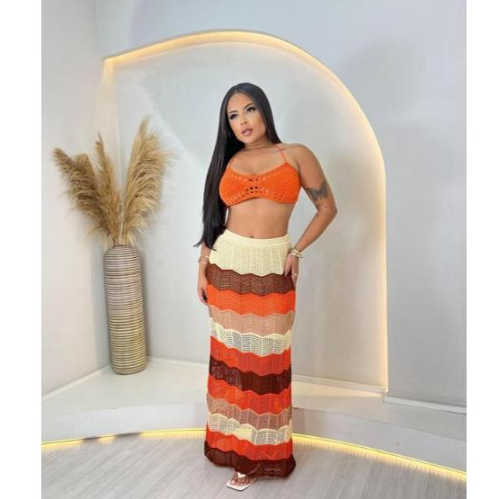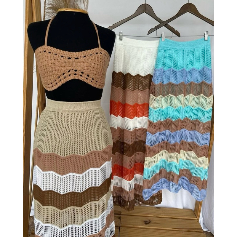 Conjunto Saia longa e Top Cropped Tricot Nude Verão Moda Praia Modal