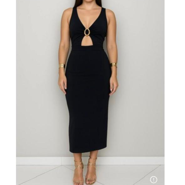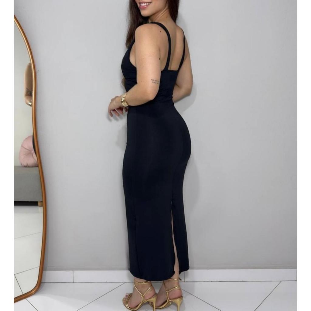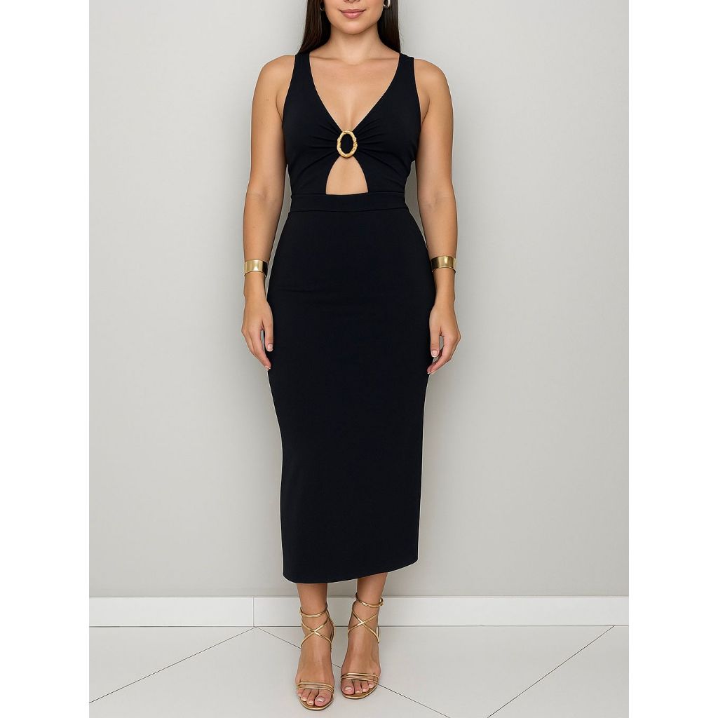 Vestido Preto Tubinho Fivela Decote Justo Suplex Midi