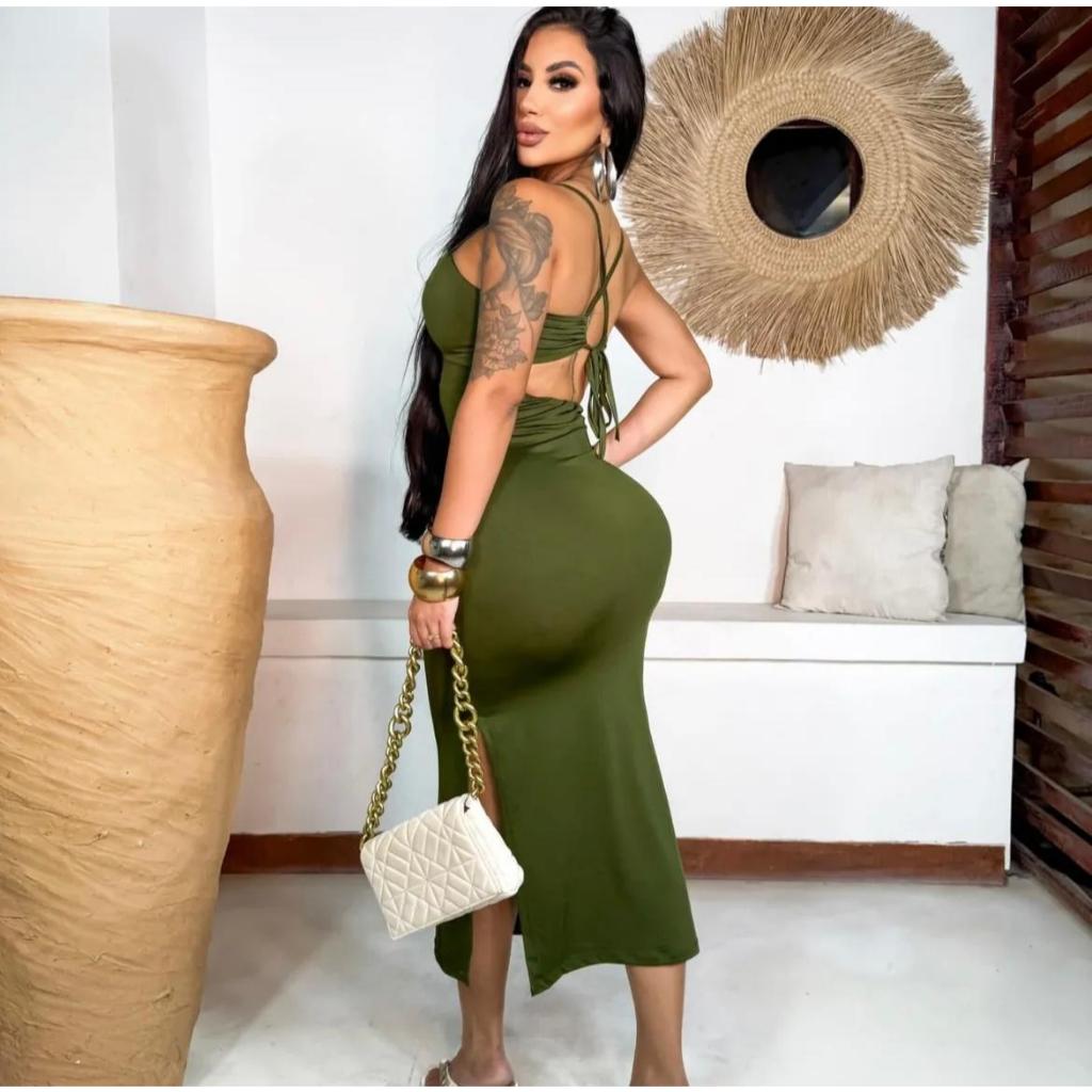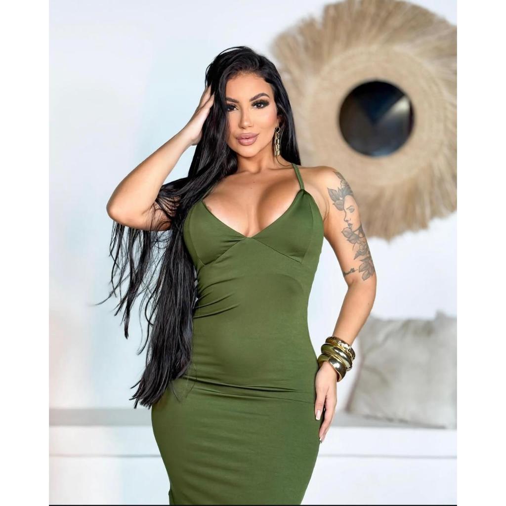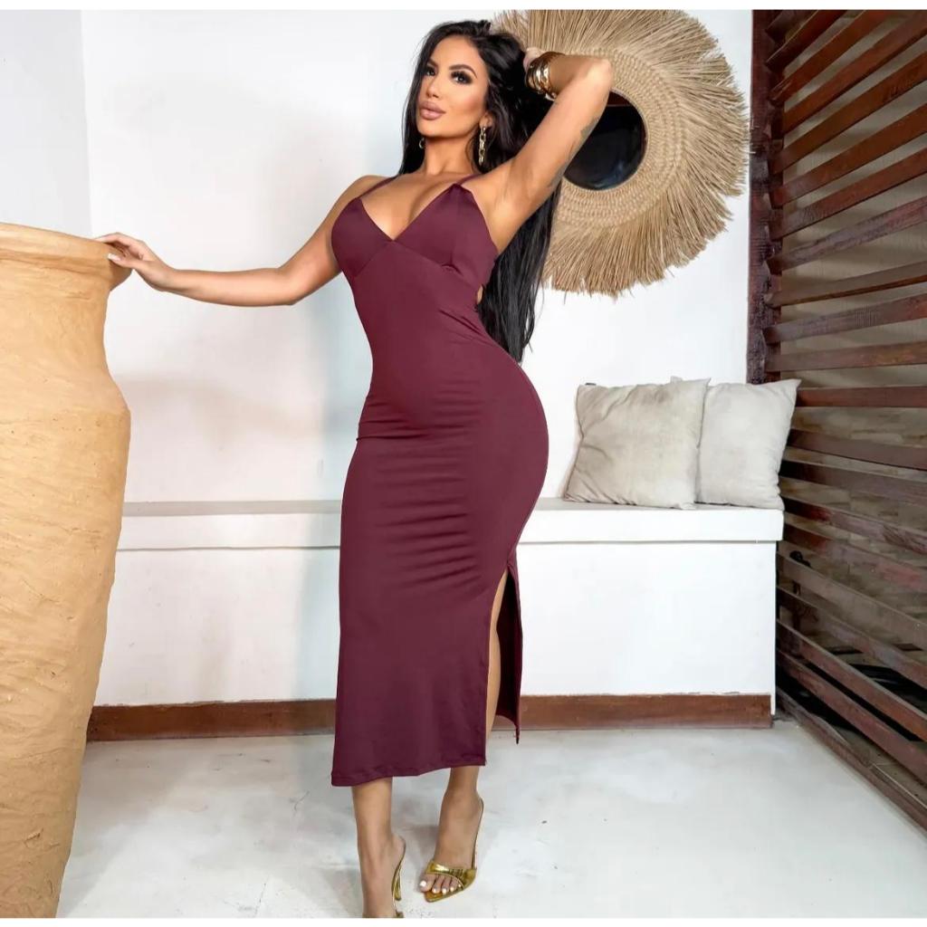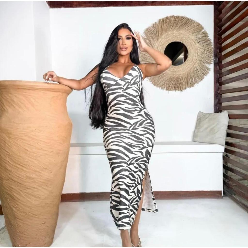 Vestido feminino longo elegante midi floral estampado poliamida decote V verão