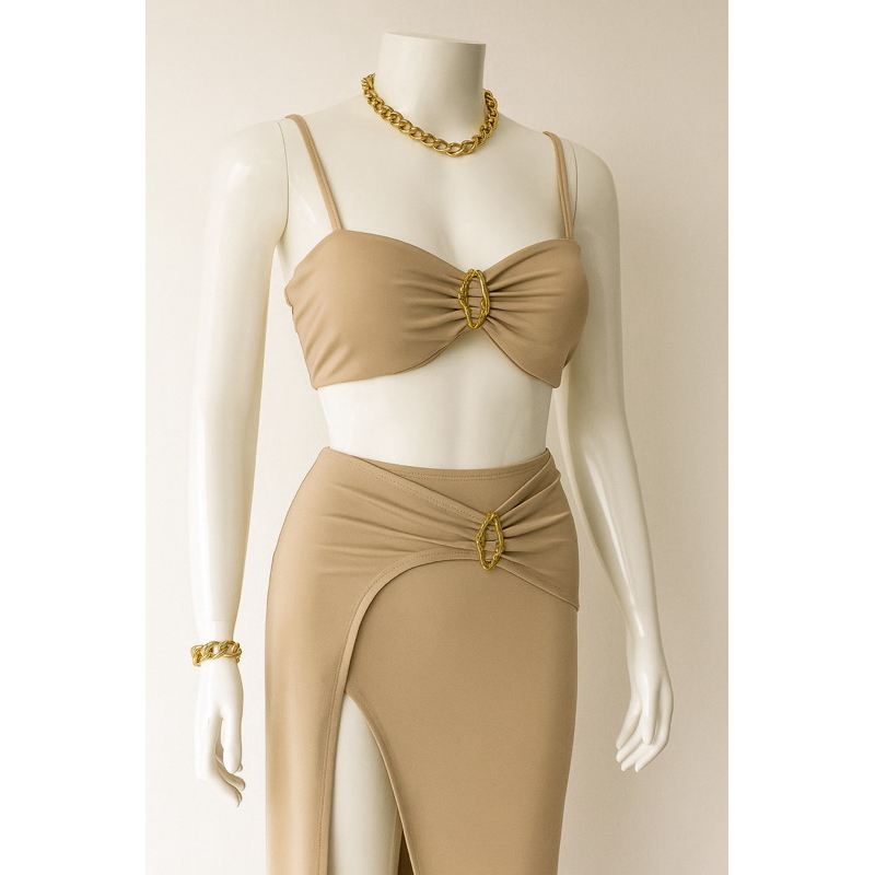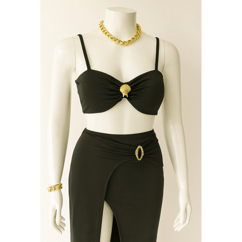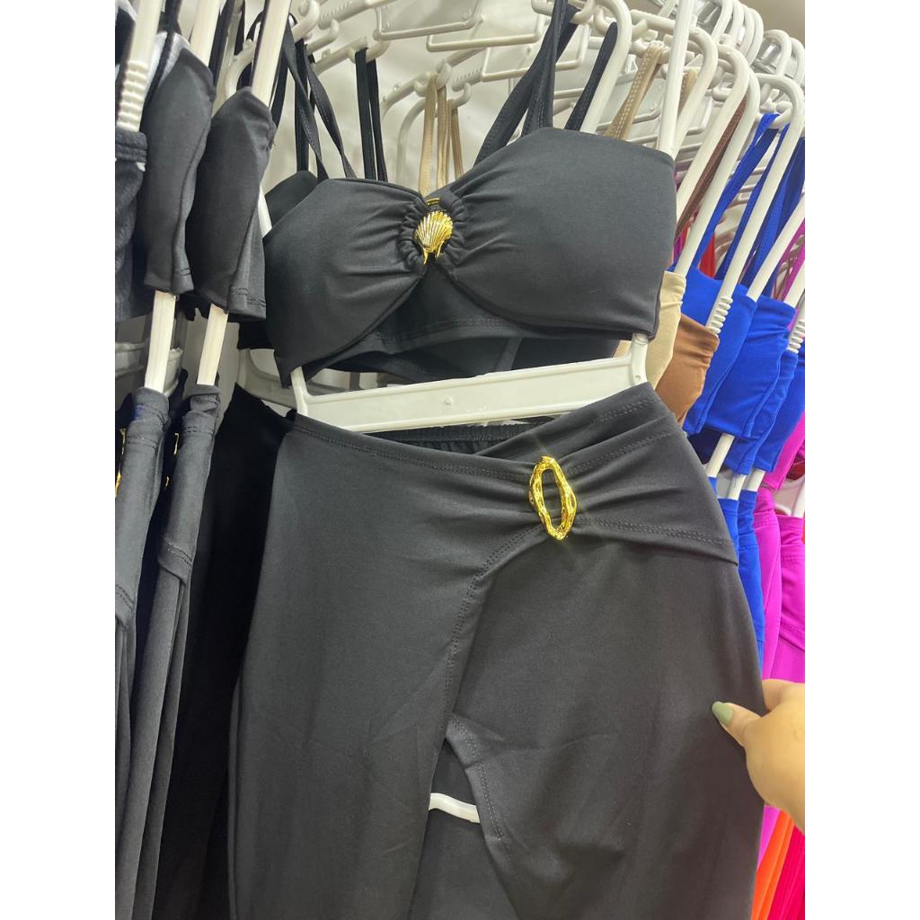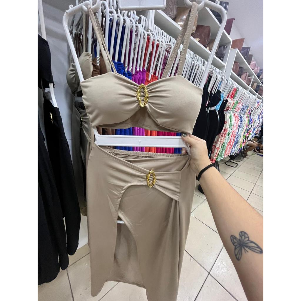 Conjunto 2 peças Saída de Praia Saia Com Fenda e Top Preto Nude Marrom com Bojo Verão Moda Praia Piscina Blogueira