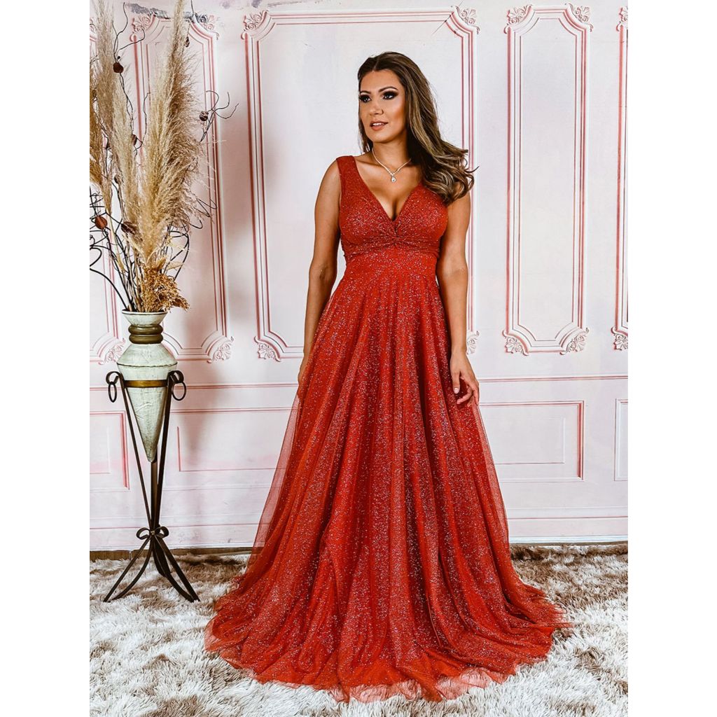 Vestido Rodado Longo Madrinha Festa Formatura Brilho Decote