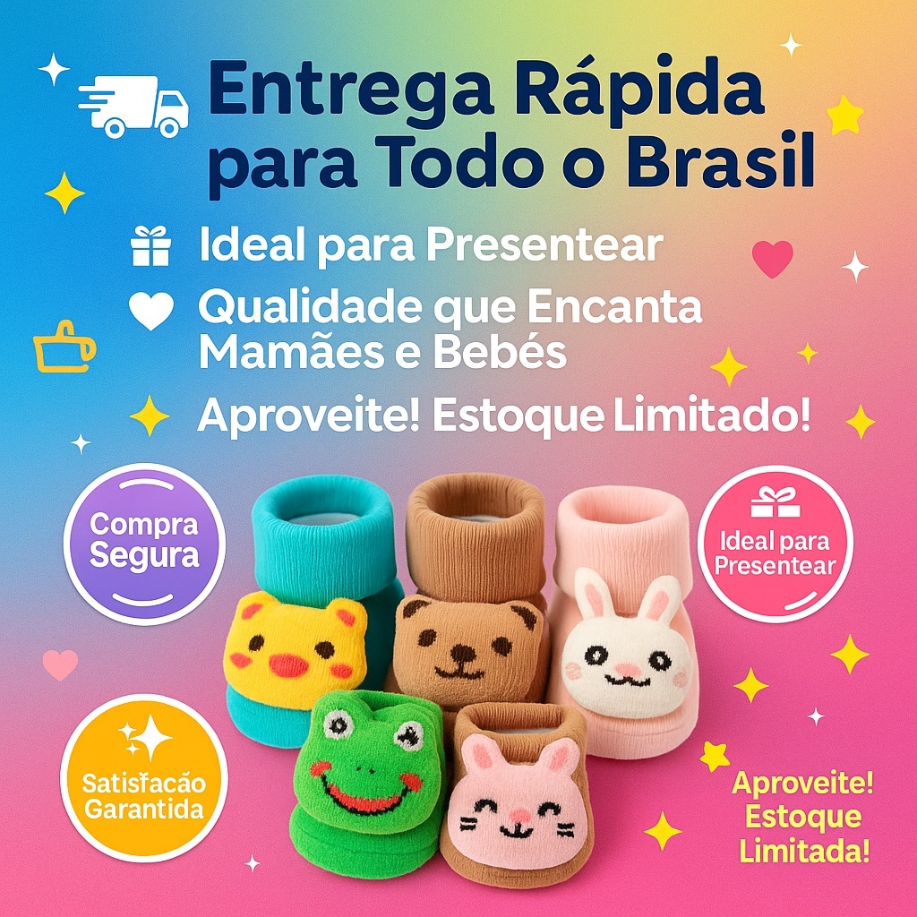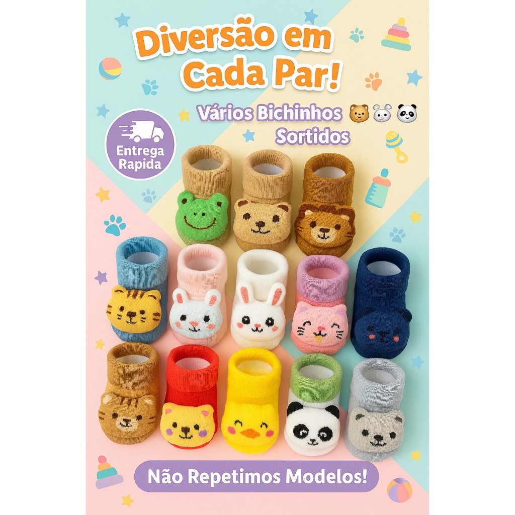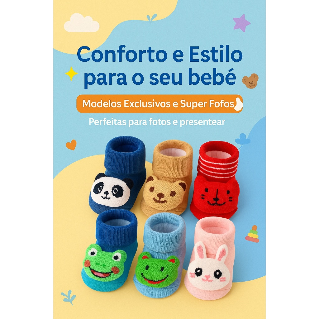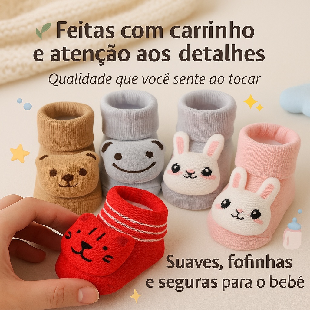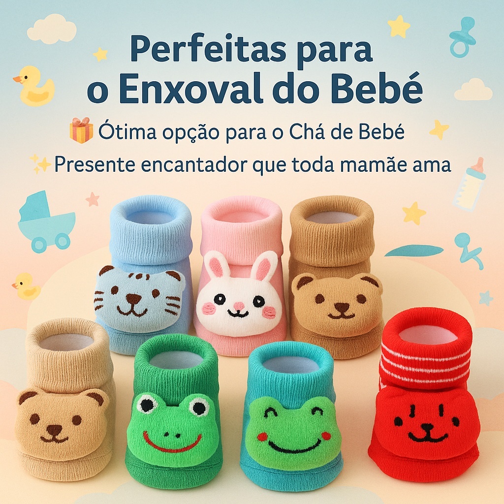 Kit Meias Infantil Sapatinho Bebe Bichinhos Fofo 3D RN Pelúcia Bebê Infantil Enxoval Menino Menina Pantufa Pelúcia