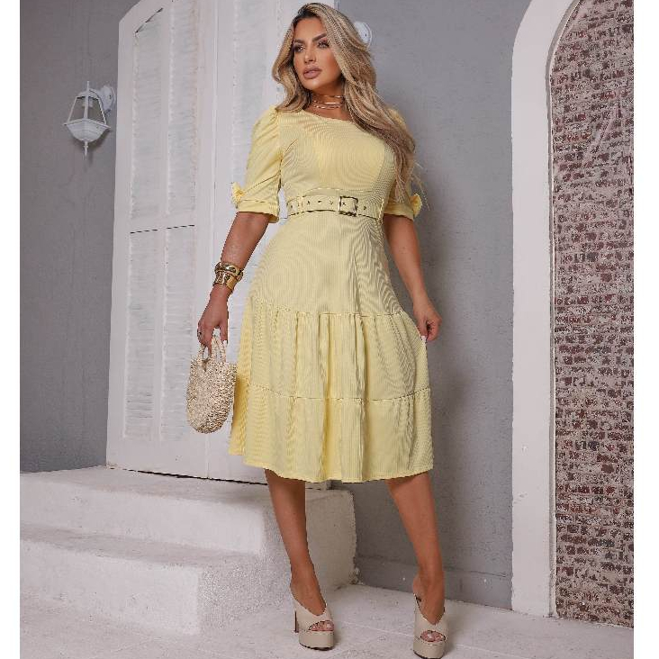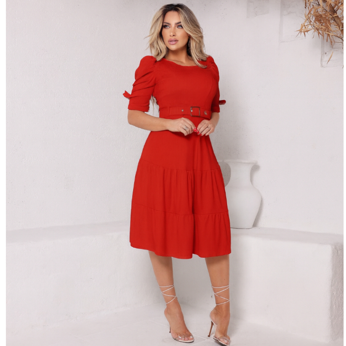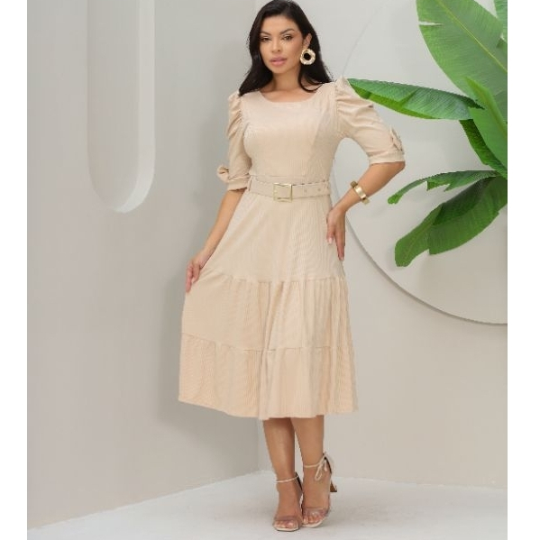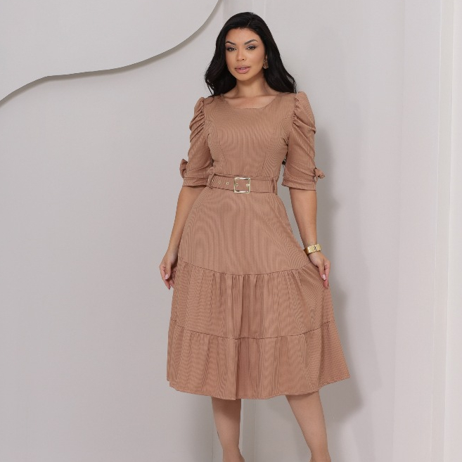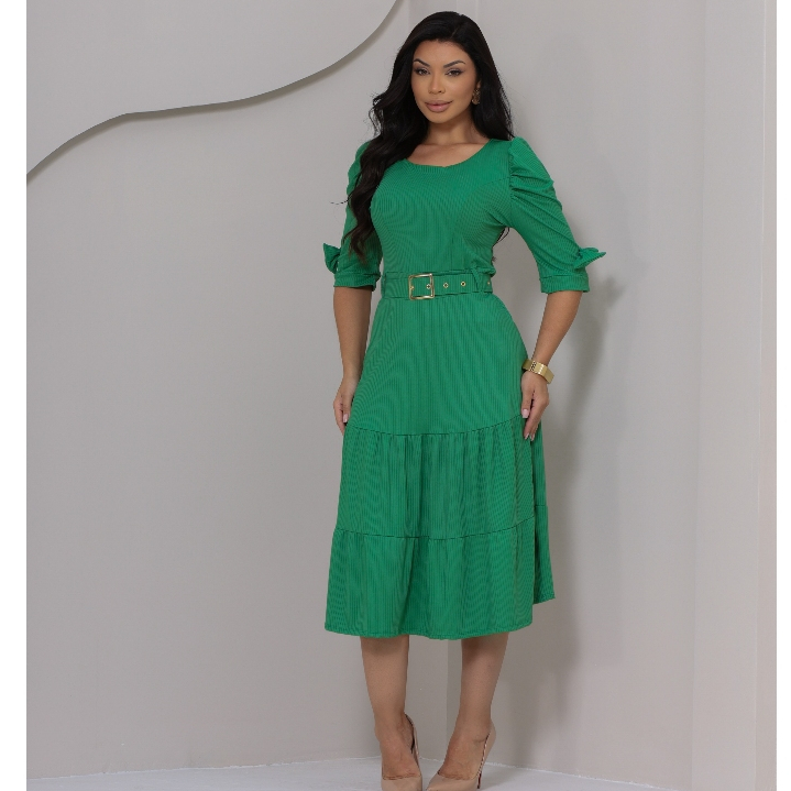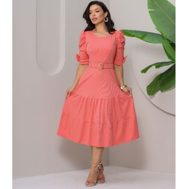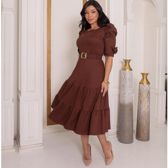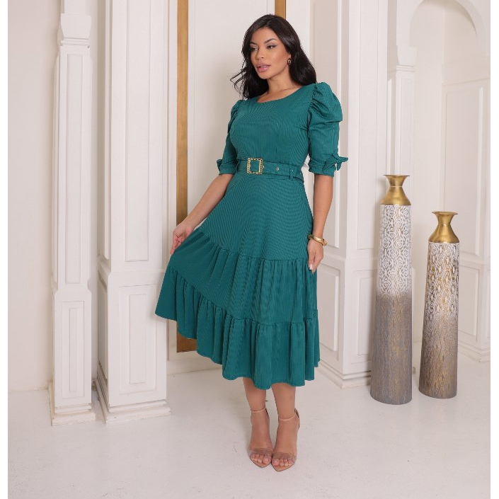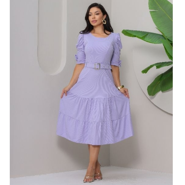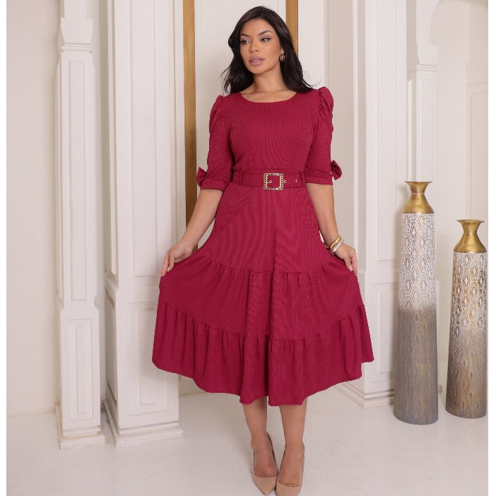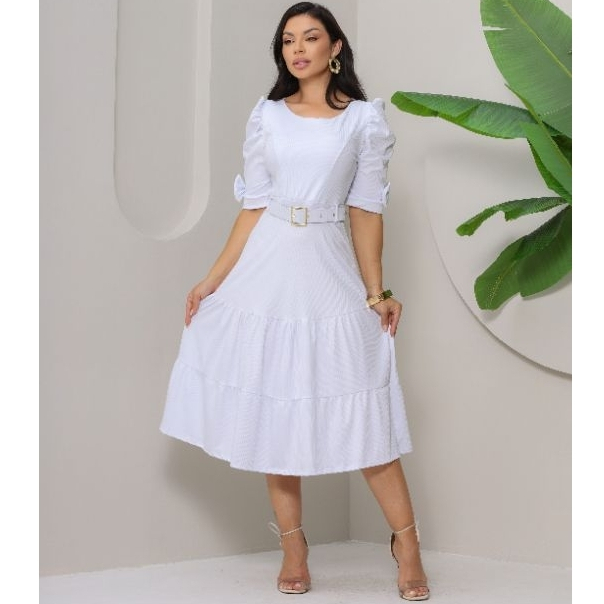 Vestidos Midi 3 Marias com Manga Bufante, Cinto Forrado Malha Canelada
