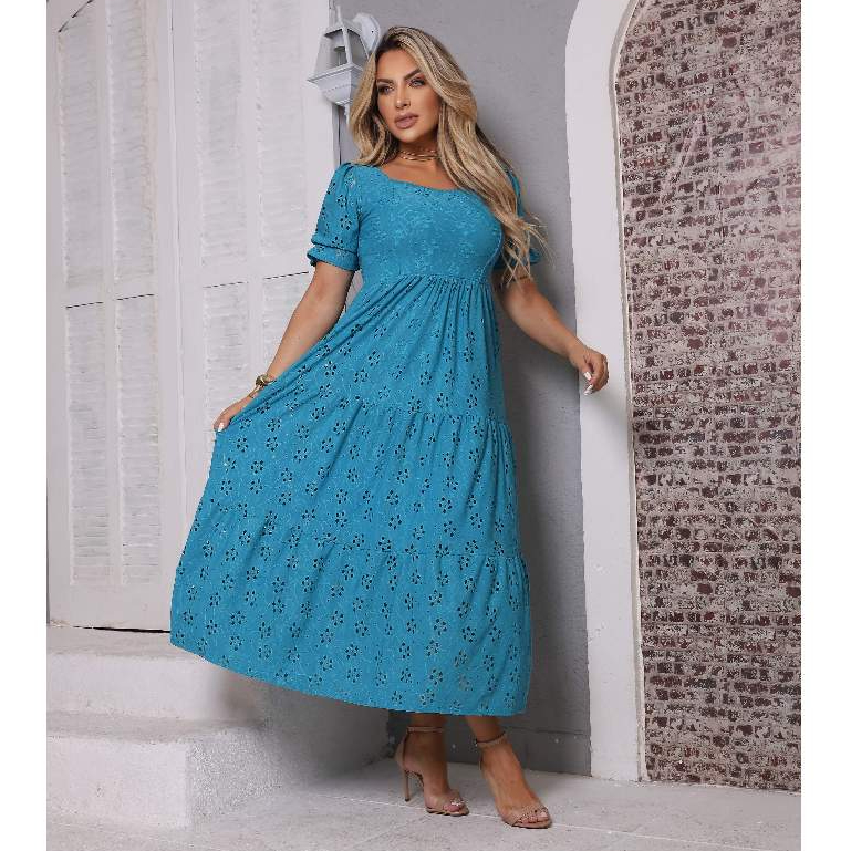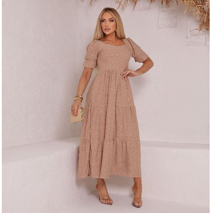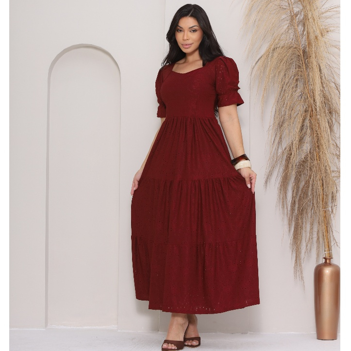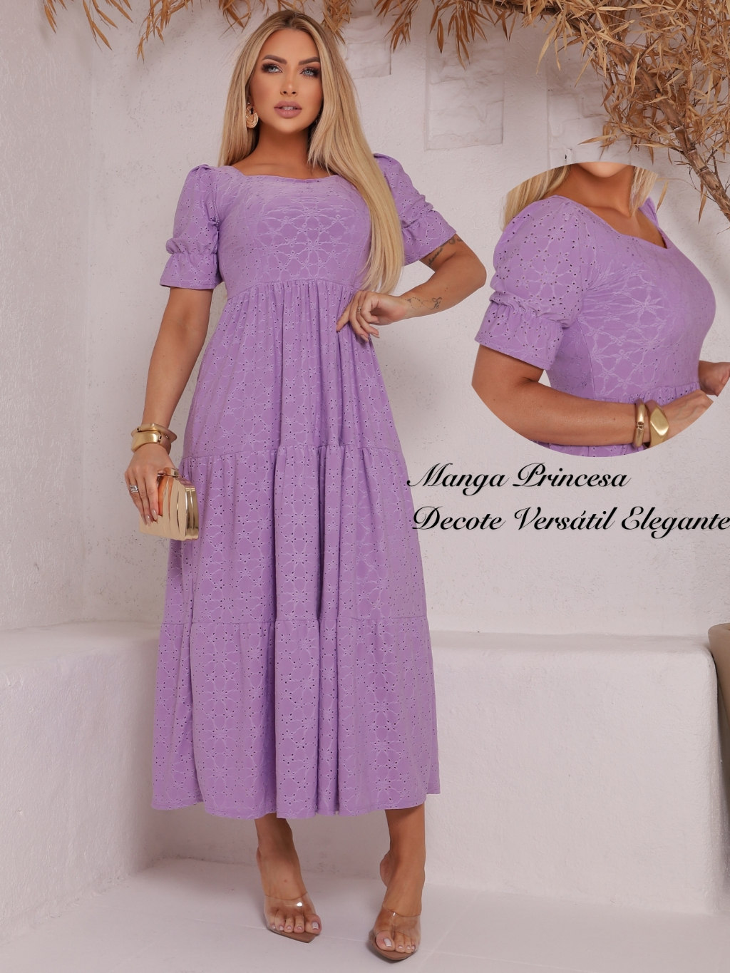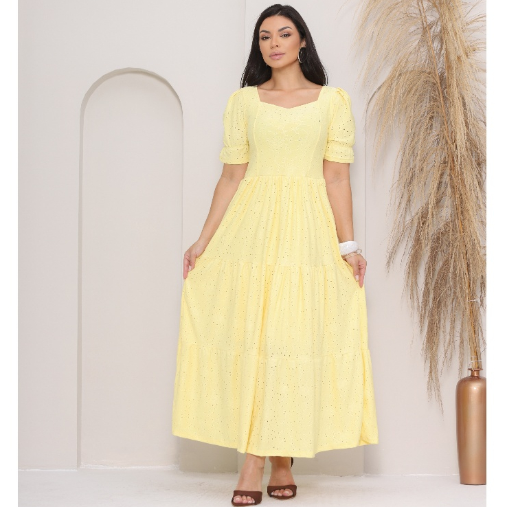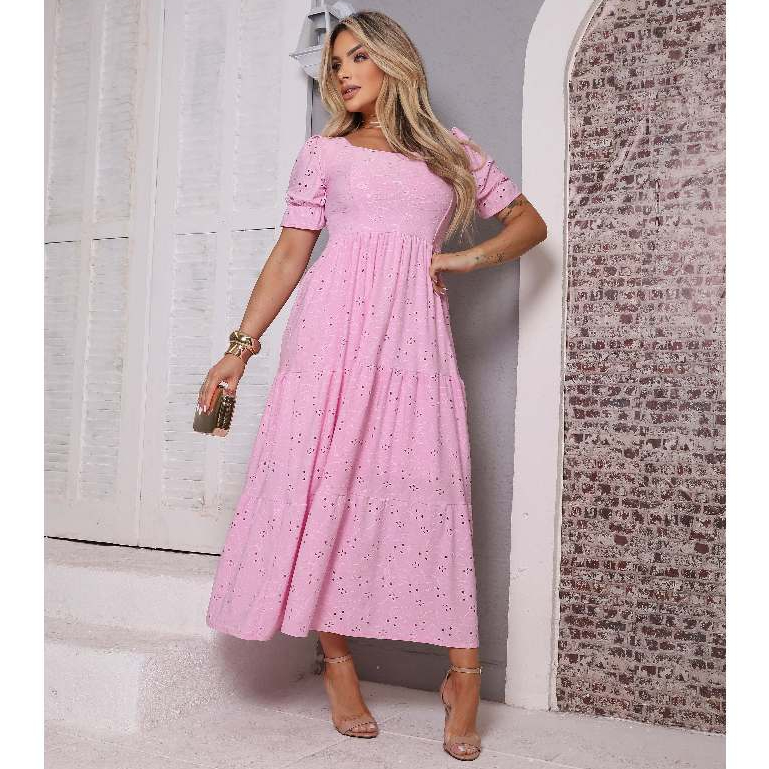 Vestido Longo Três Marias Feminino Malha Laise Midi Manga Bufante Forro no Busto e Saia, Cores Candy
