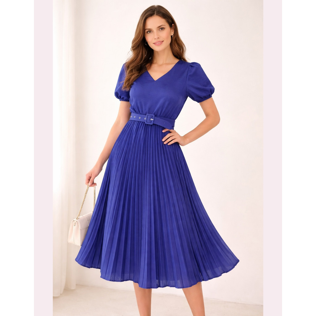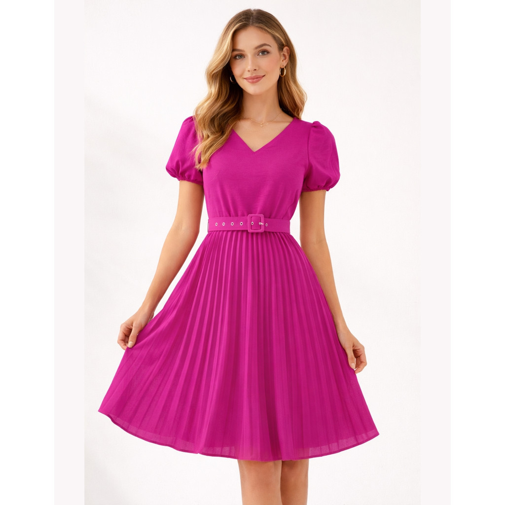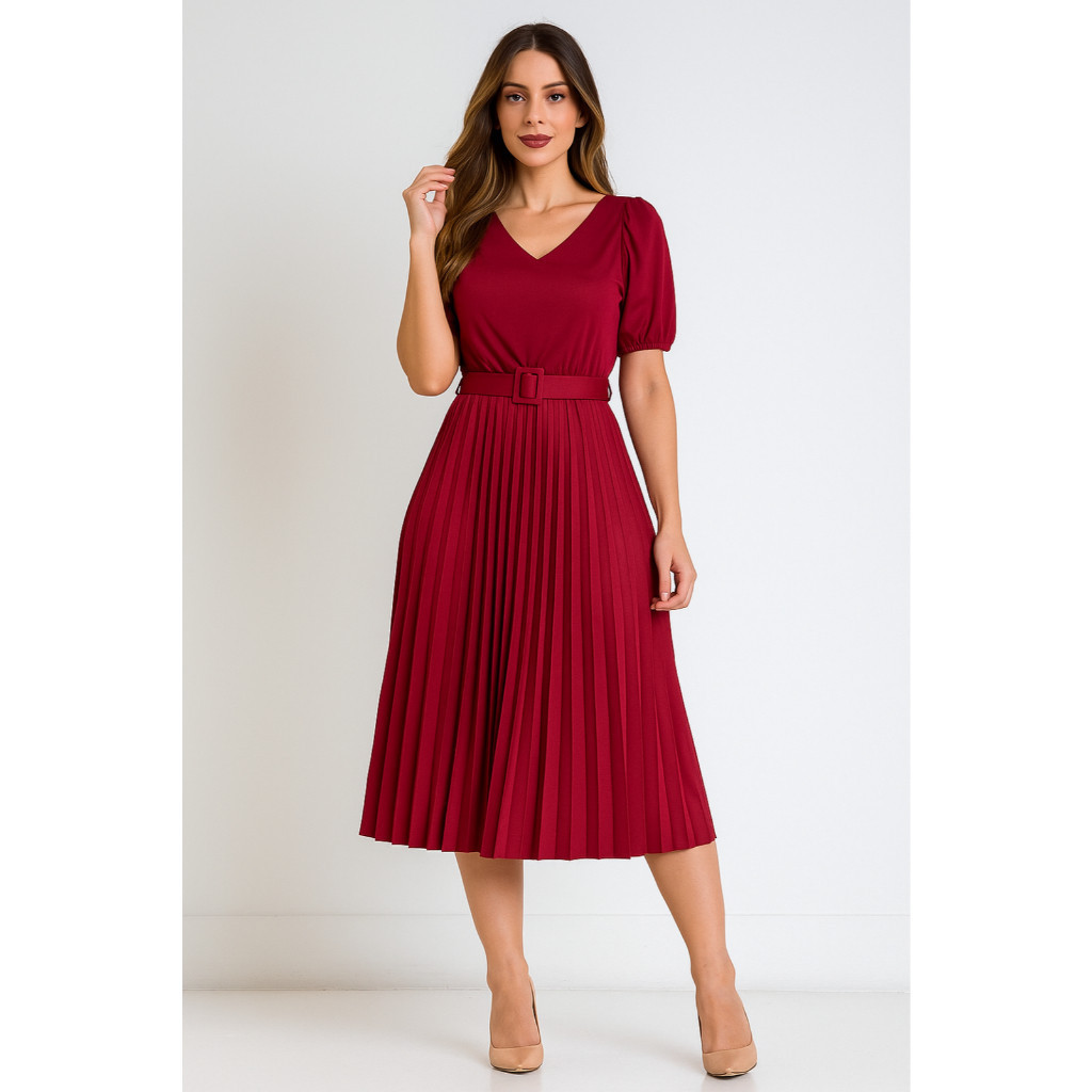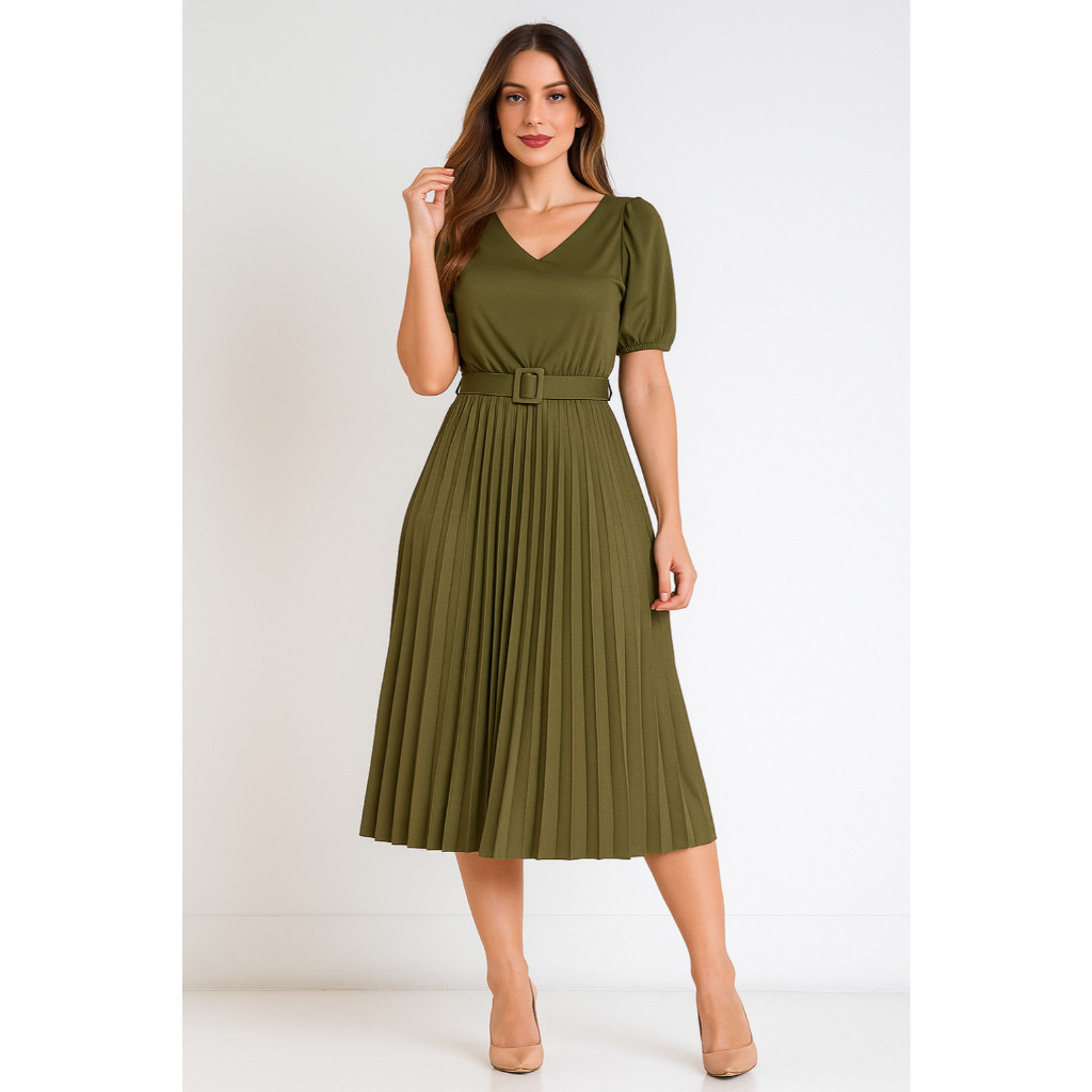 Vestido Plissado Lisa Midi Rodado Moda Evangelica Manga Bufante e Cinto