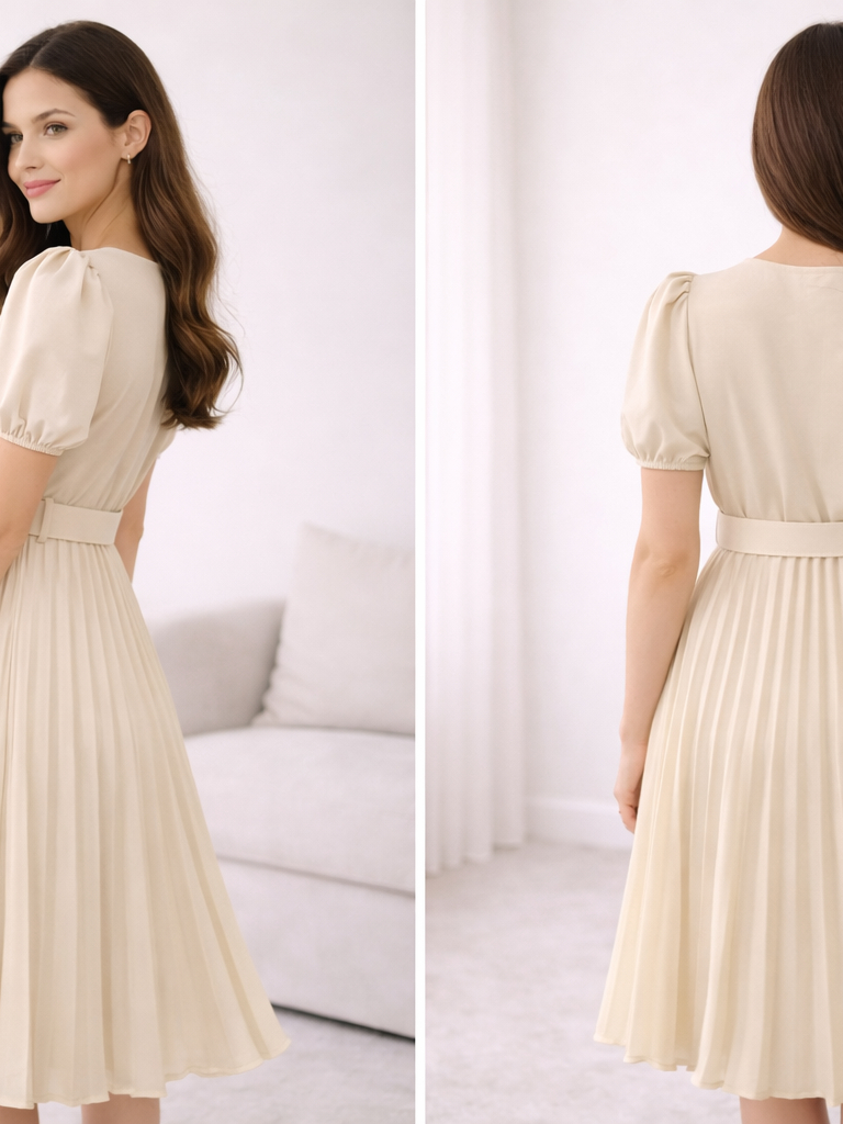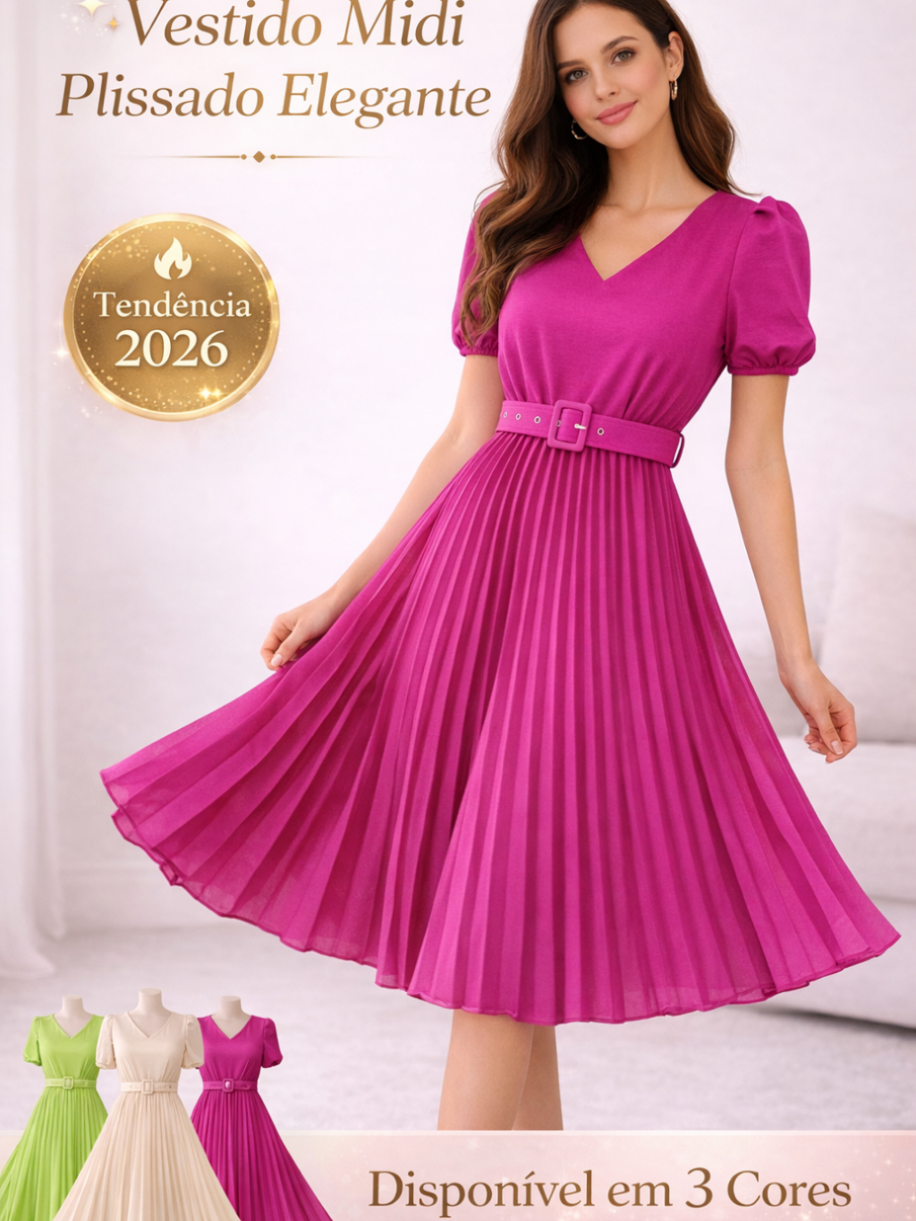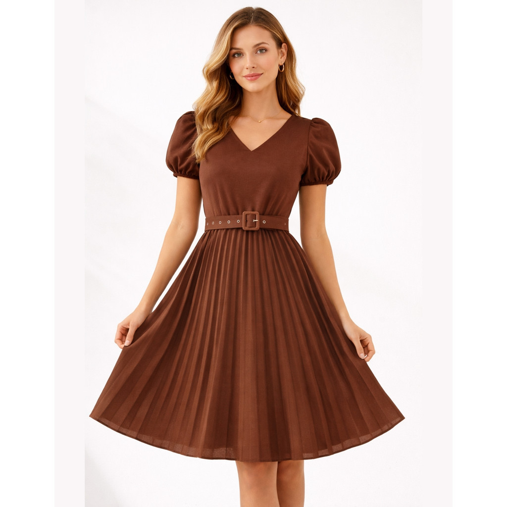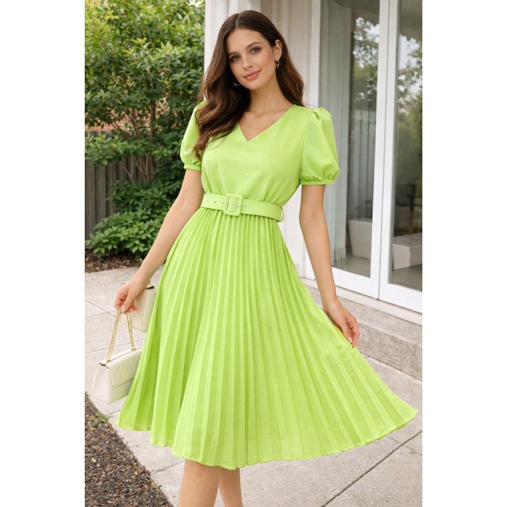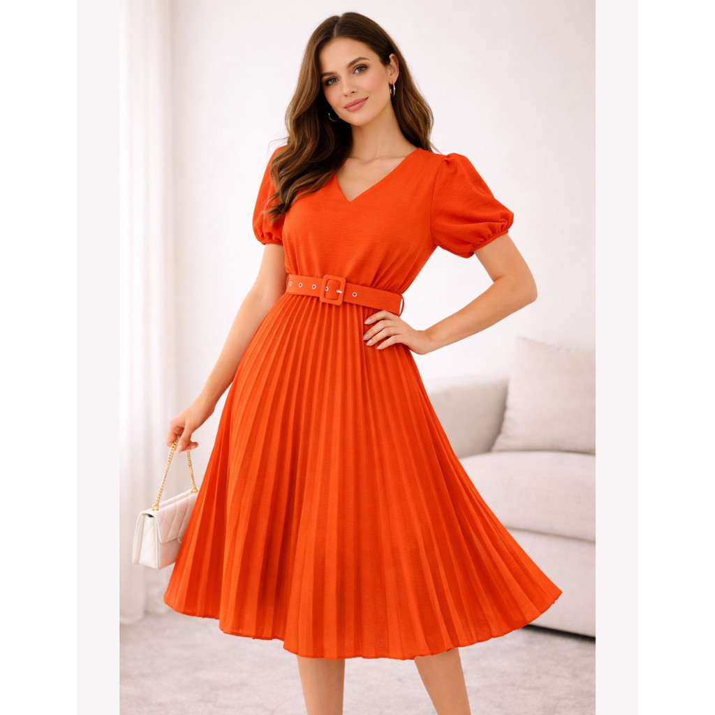Vestido Plissado Lisa Midi Rodado Moda Evangelica Manga Bufante e Cinto