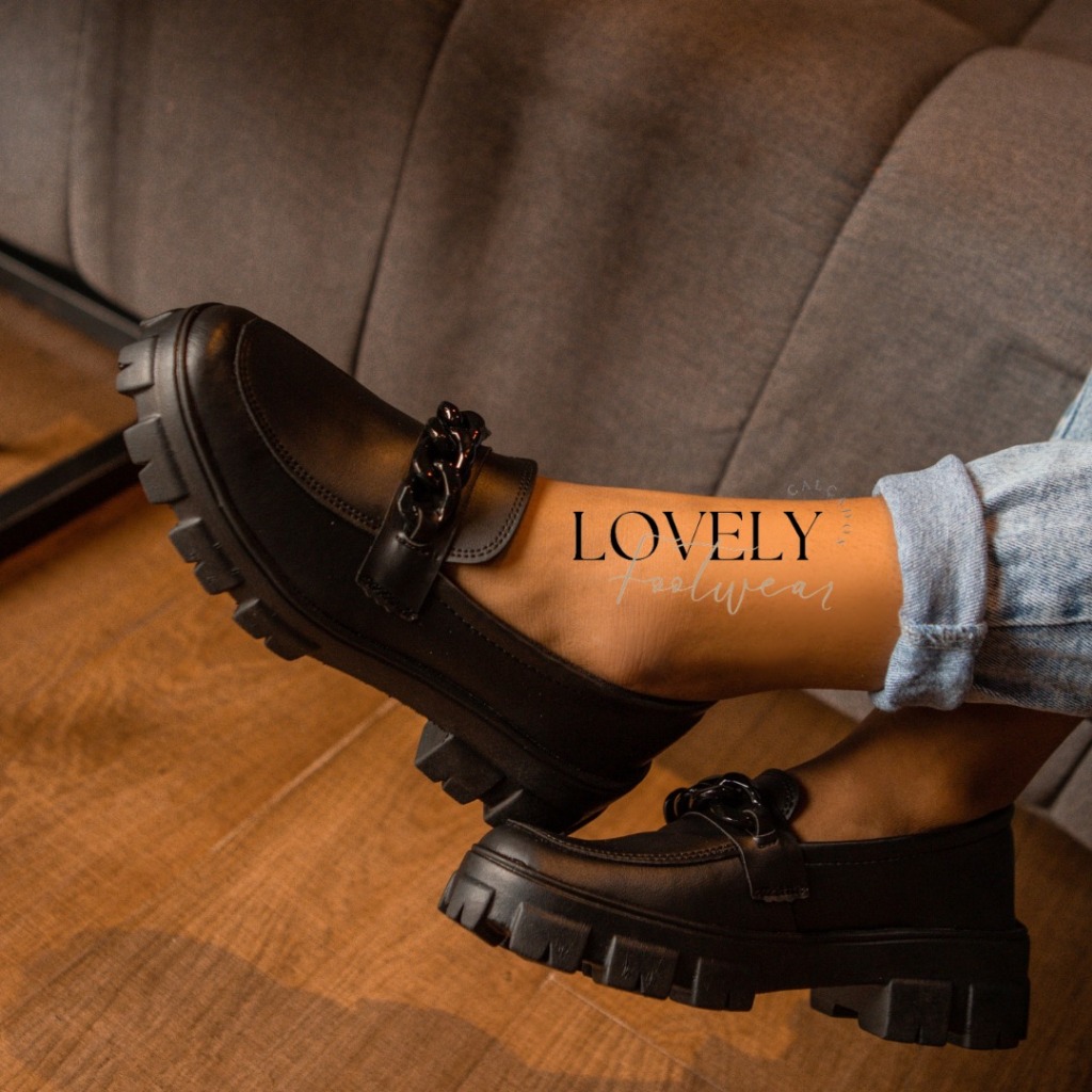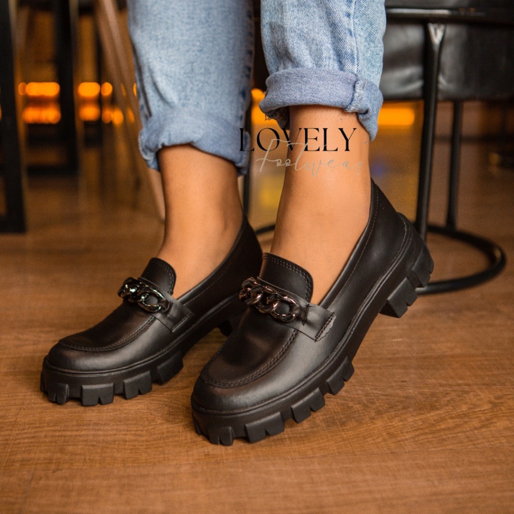 Sapato Mocassim Feminino Tratorado Preto Verniz Blogueira Corrente Super Confortável Promoção Imperdível