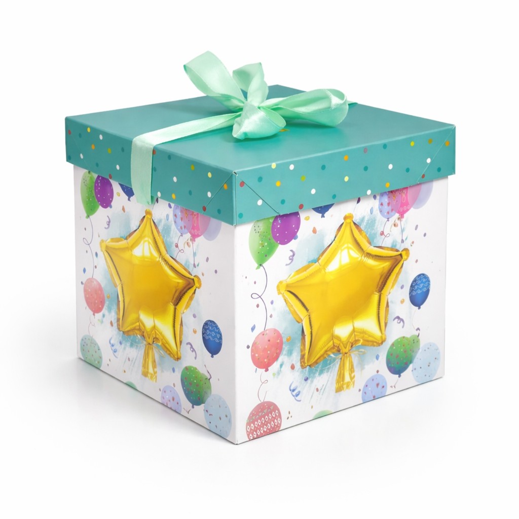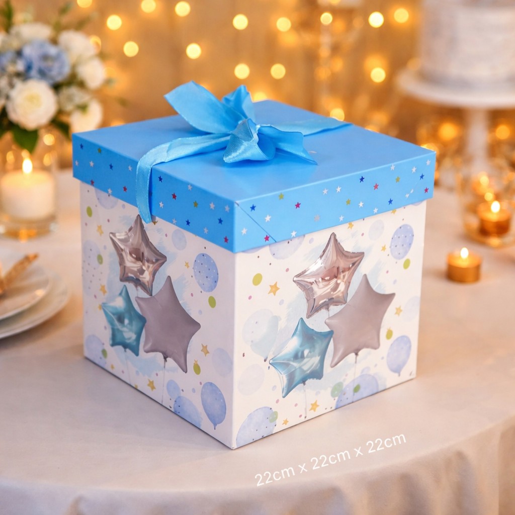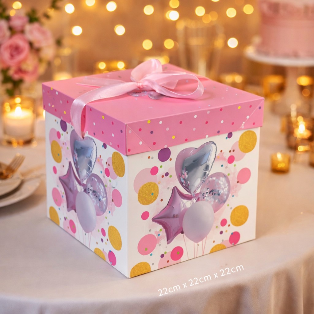Caixa De Presente Média 22x22x22 Com Laço - Aniversário Festa Balões Felicidades Comemoração