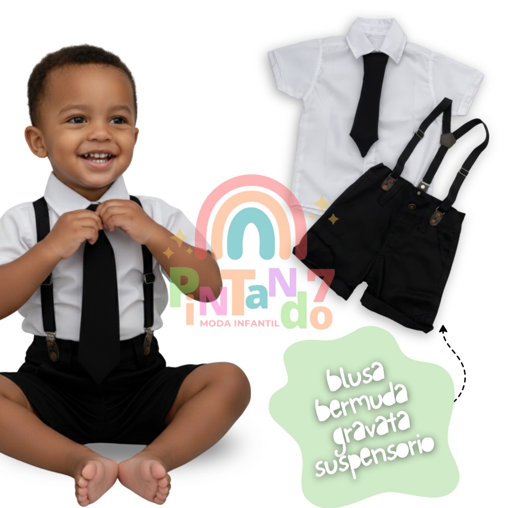 CONJUNTO festa PODEROSO CHEFINHO BRANCA LISA roupa infantil para menino Camisa Gravata Bermuda e Suspensório