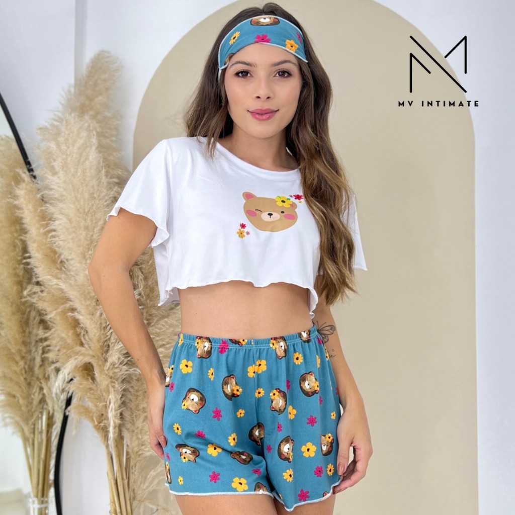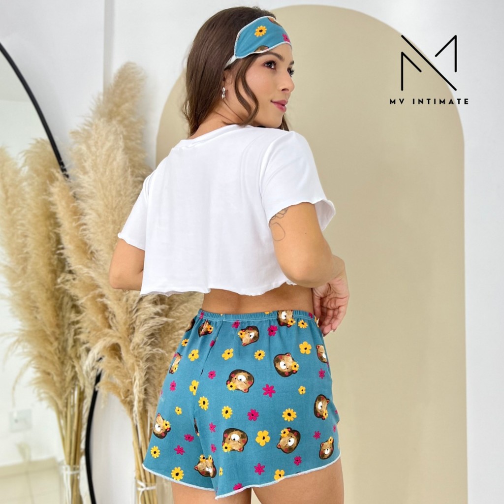 Baby Doll Estampado Curto Cropped Com Manga Cropped e Tapa Olho