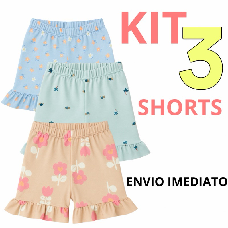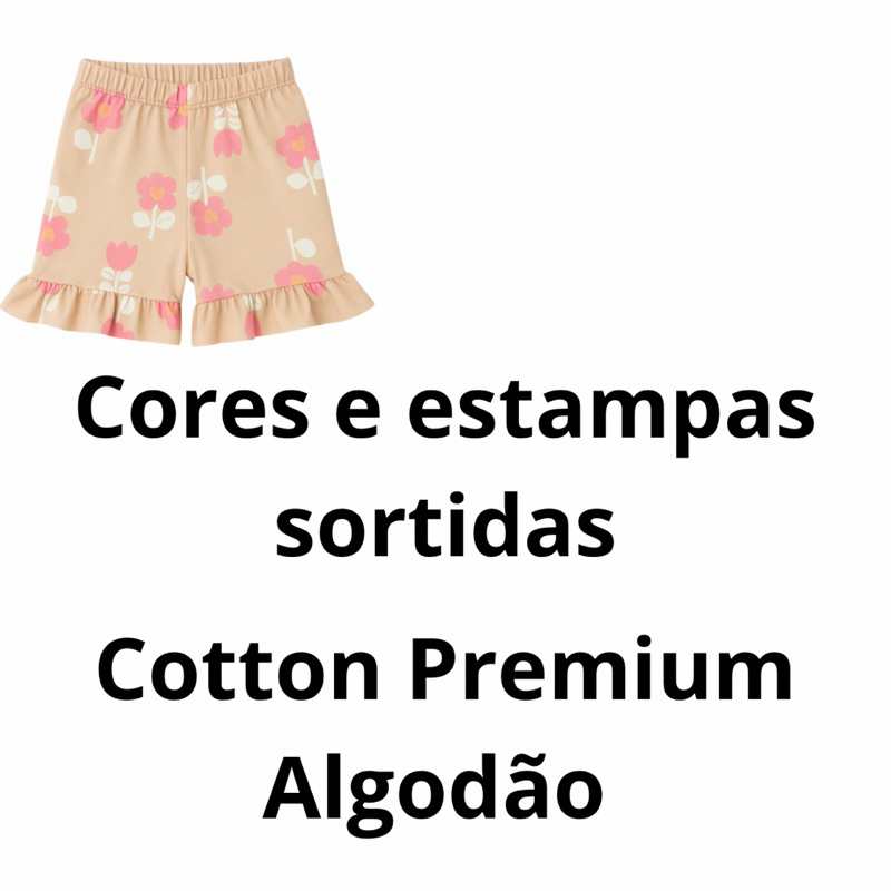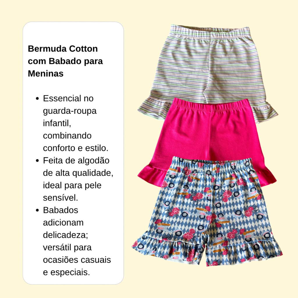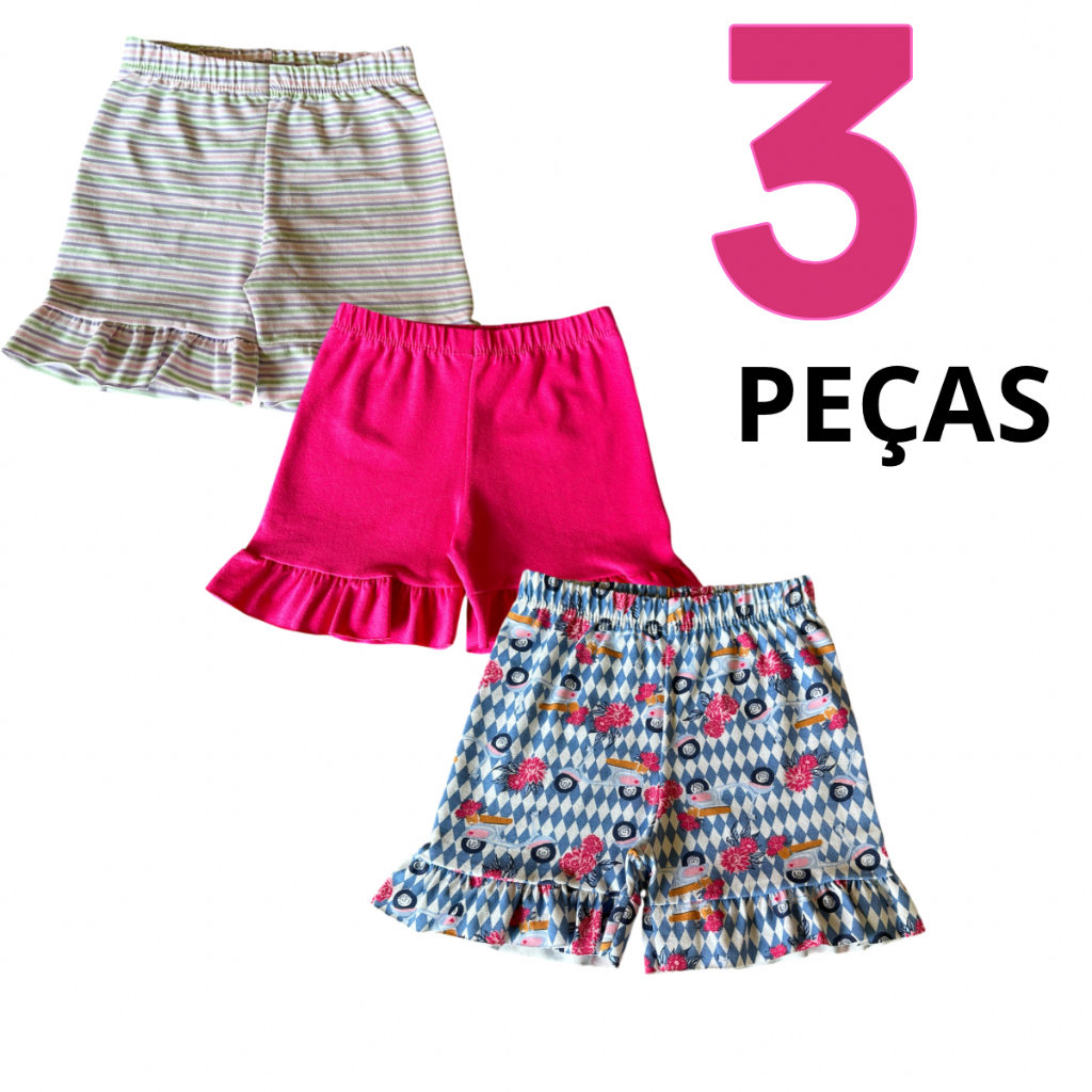 Kit 3 Short Coton Algodão Detalhe Babado na Barra 2 a 12 anos Cores Lisas e Estampas Sortidas (0043)
