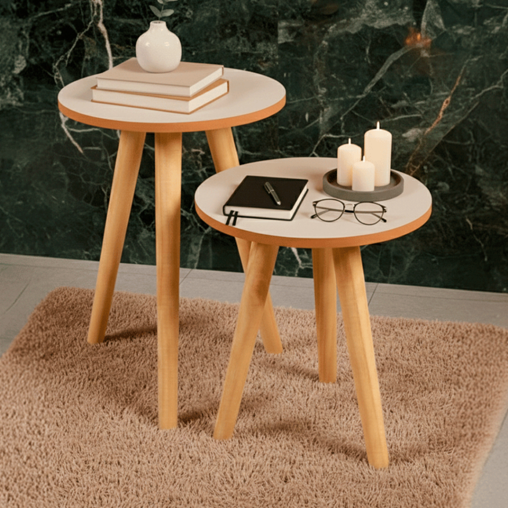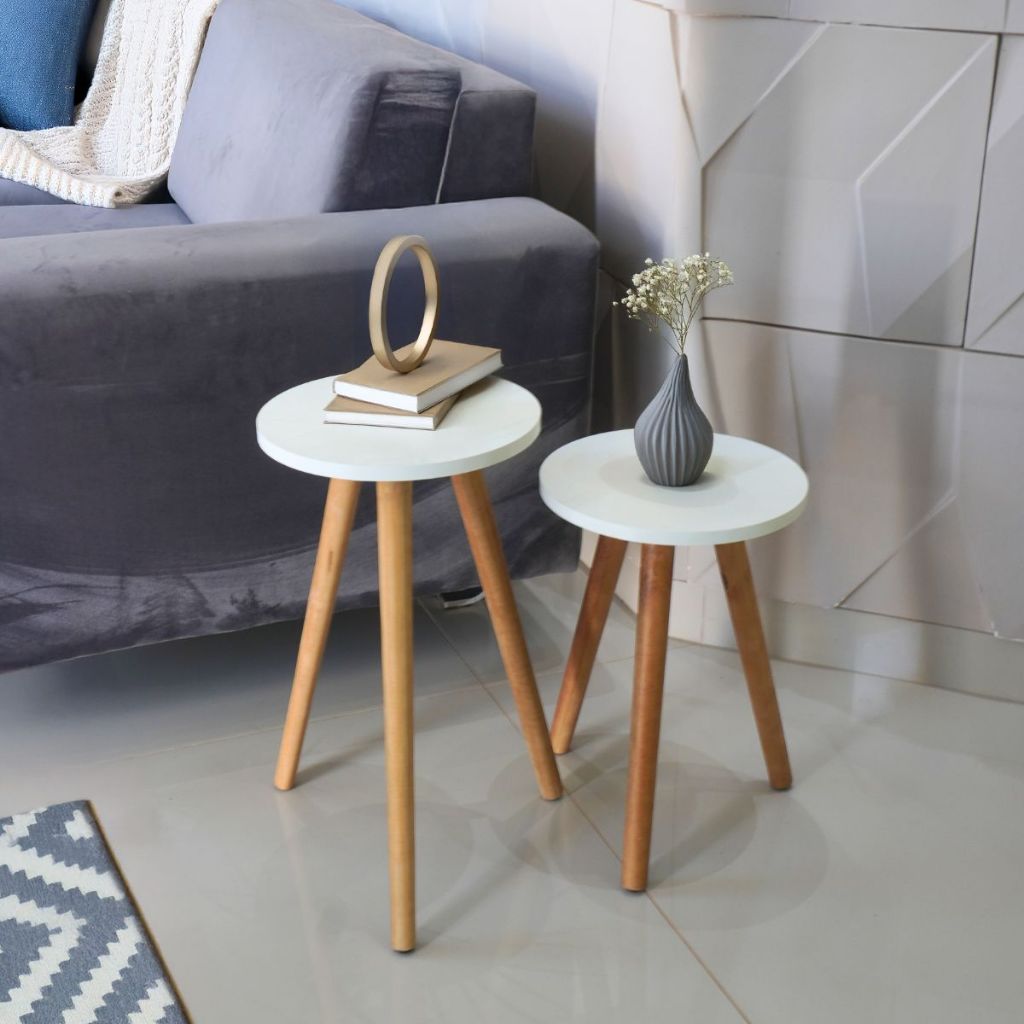Conjunto de Mesinha Lateral Redonda Sala Pe Madeira Retro Sala Quarto