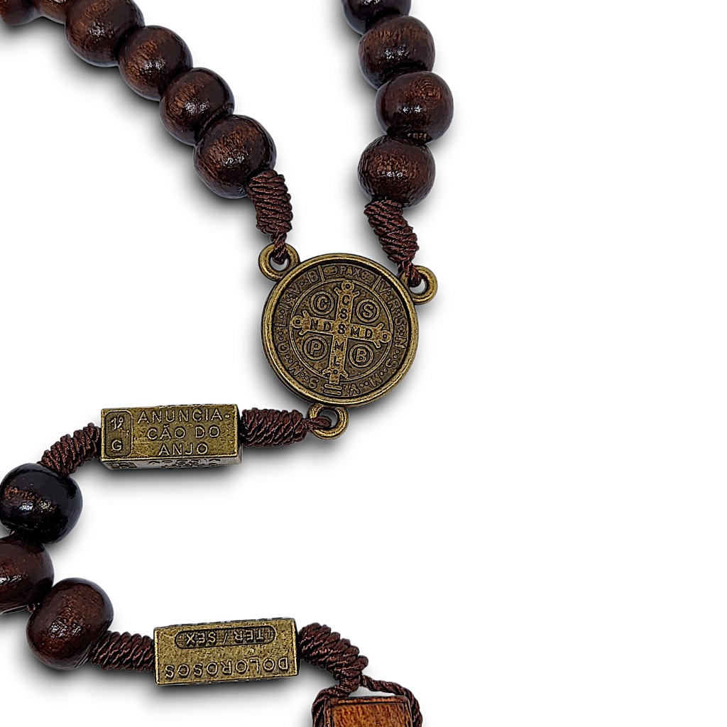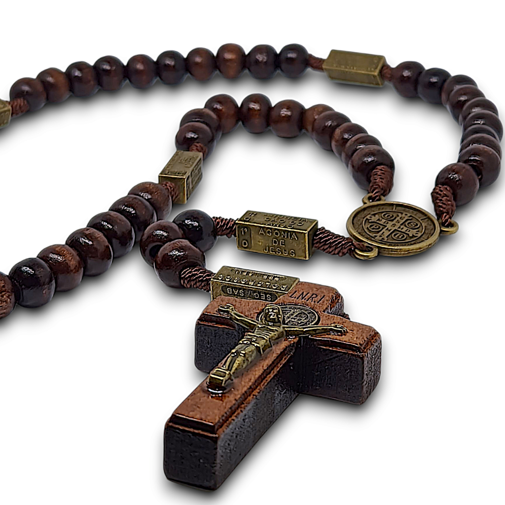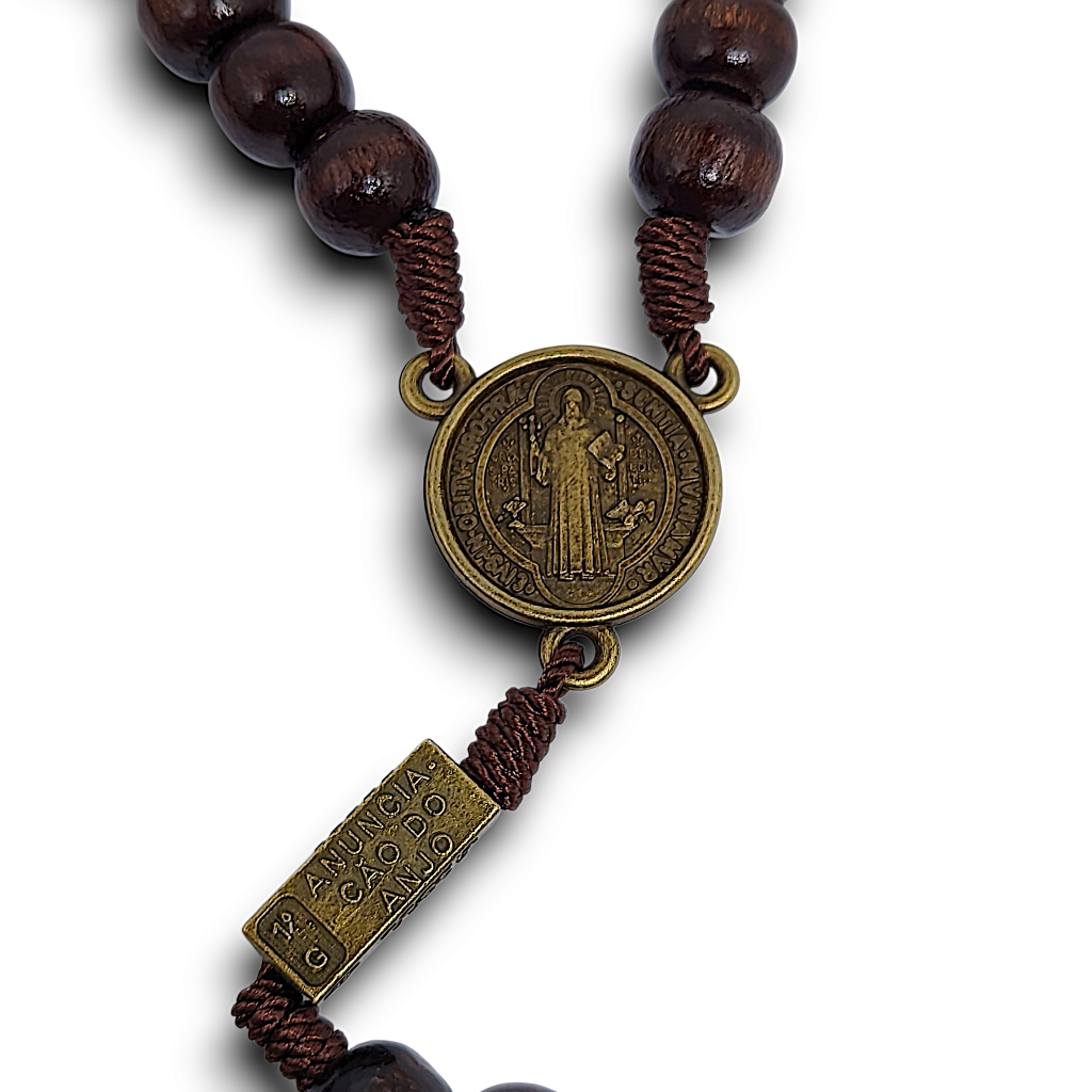 Terço Luxo São Bento Madeira Envernizada Rosário Para Pescoço Rezar