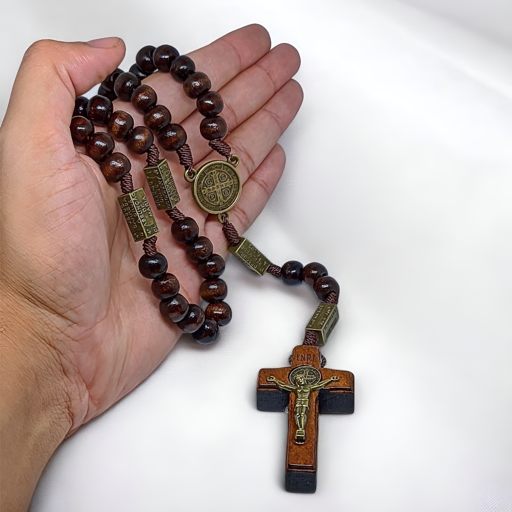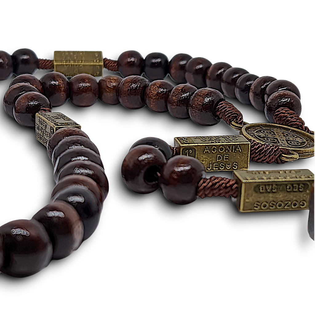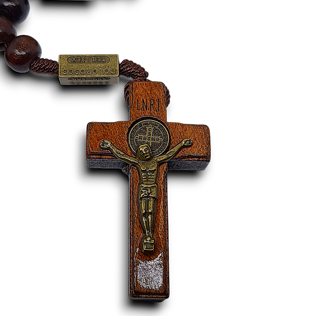 Terço Luxo São Bento Madeira Envernizada Rosário Para Pescoço Rezar