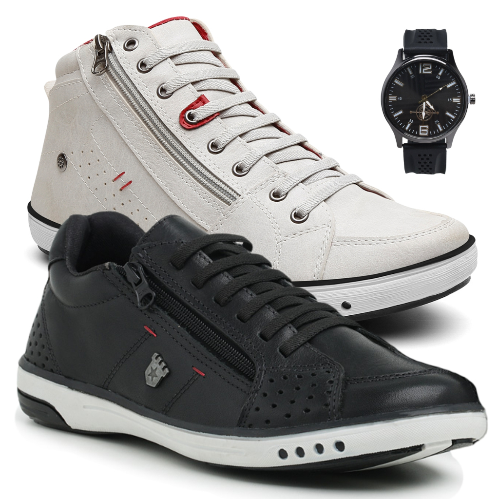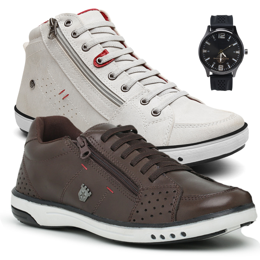 2 Sapatênis Masculino Couro Casual Com Ziper Anti Stress Moderno Calce Fácil