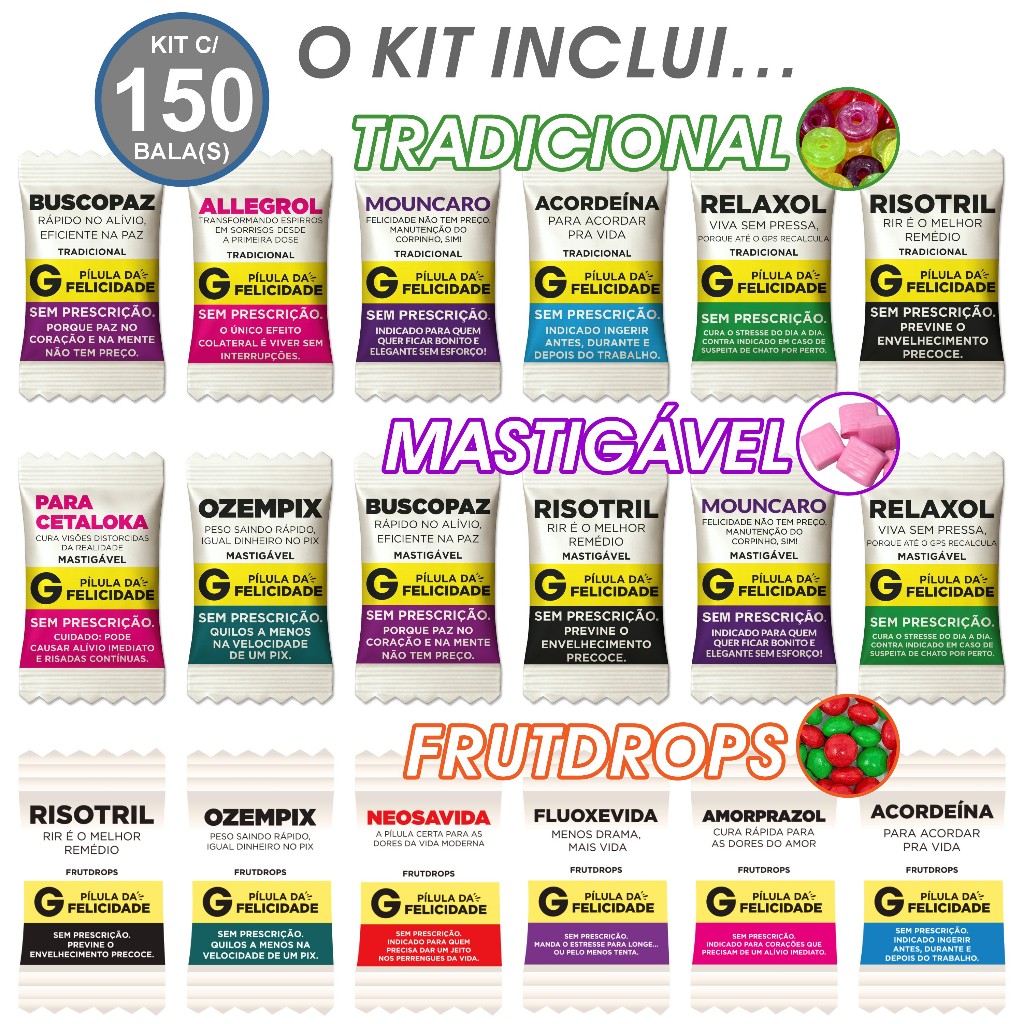 Kit Festa Balas Pílulas Felicidade Divertidas (Balas Soft, Drop, Mastigável Já Personalizadas)