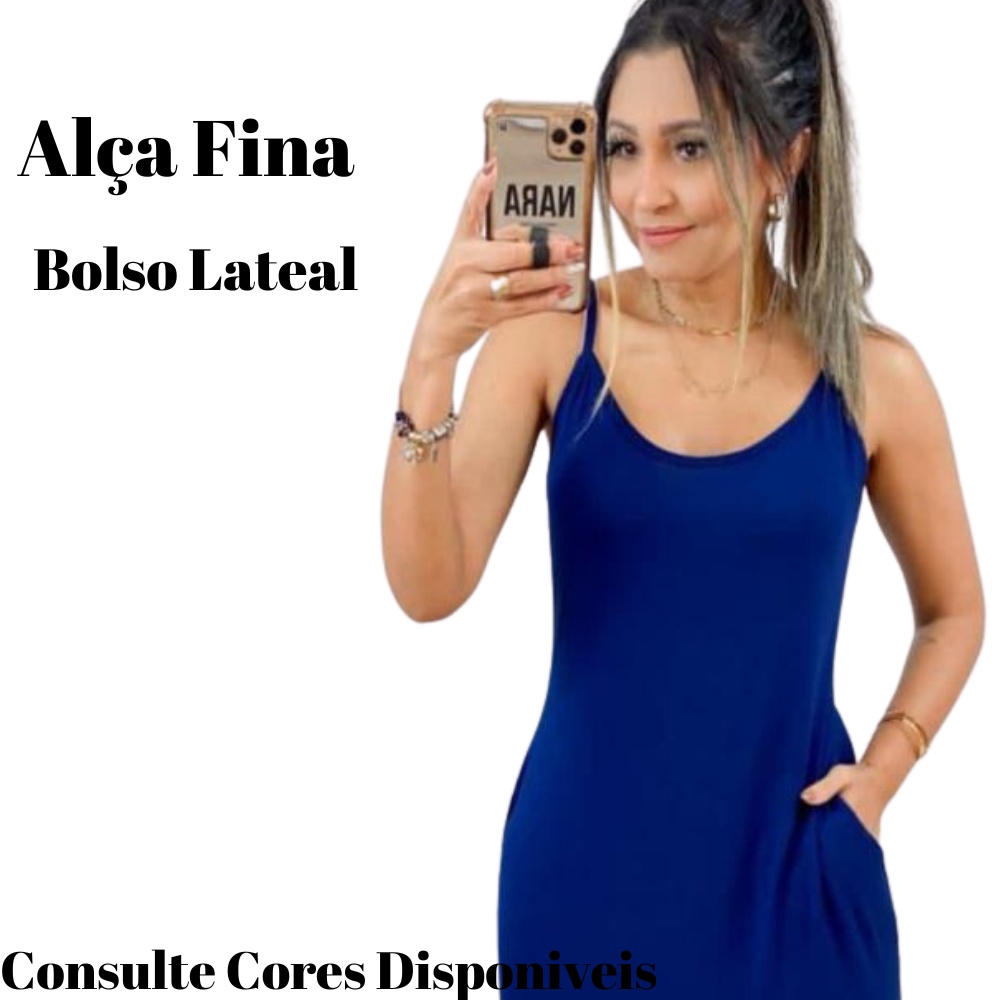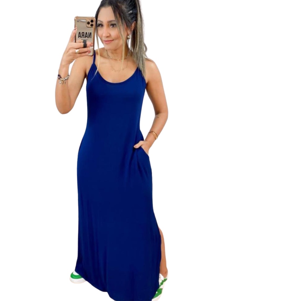 Vestido Longo Feminino Casual Fresco em Malha Alça Fina e Nadador Liso Fenda Lateral Tendencia Moda