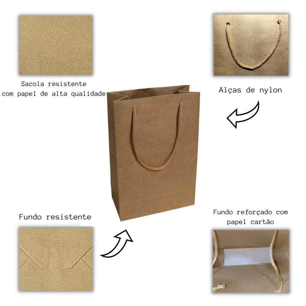 Sacolas Kraft 34x22x10cm Bolsa Papel 110 Gramas Presentes Delivery Comércio 10 a 50 Unidades