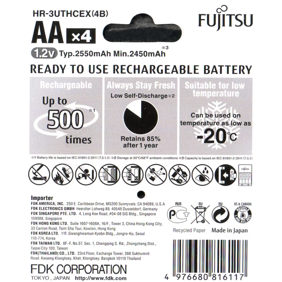 Cartela c/ 4 pilhas PRETAS AA recarregáveis FUJITSU PREMIUM, modelo HR-3UTHC