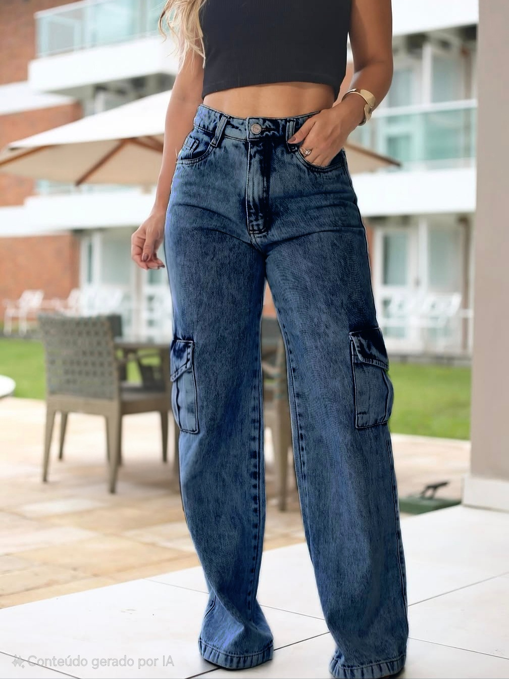 Calça Wide Leg CARGO Jeans Feminina Cintura Alta pantalona