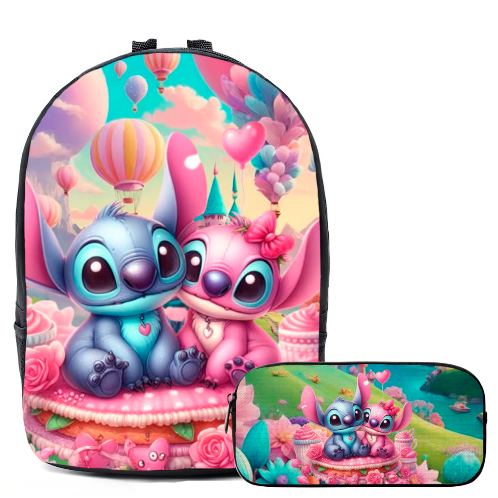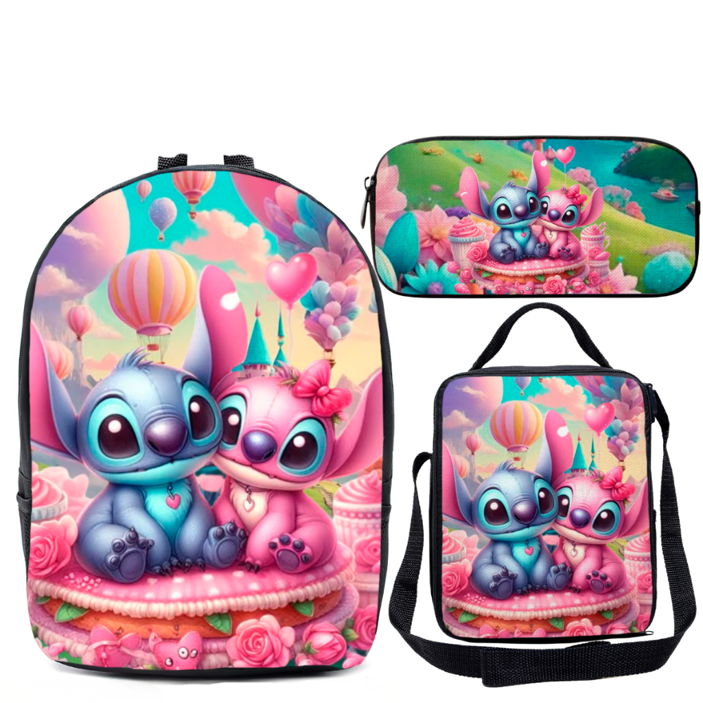 Kit Mochila Escolar Com Estojo e Lancheira Infantil Lilo Stitch Alien Azul Volta as Aulas