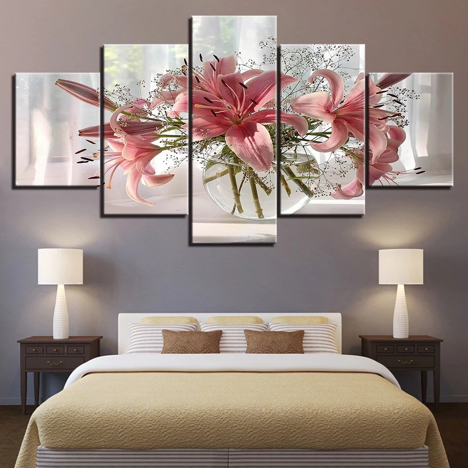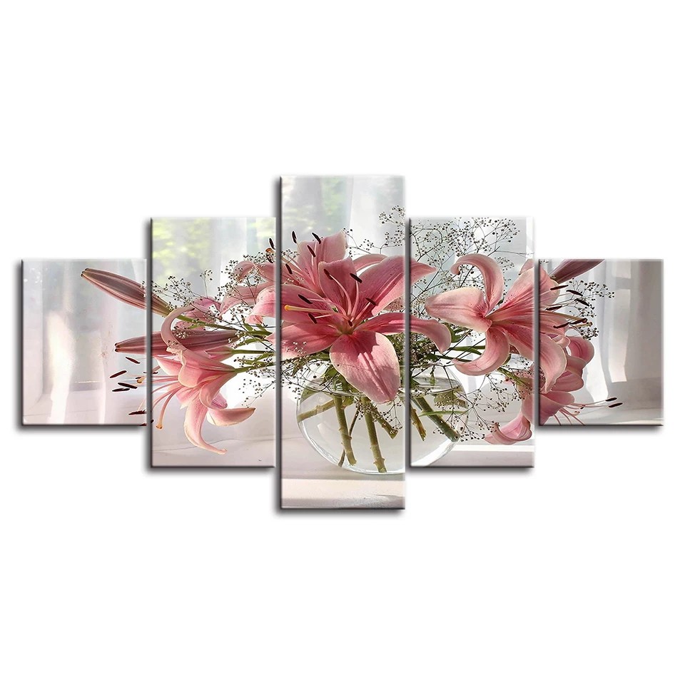 Kit Quadros Decorativo Mosaico 5 peças MDF Flor Rosa Lírio Arte Sala Quarto Cozinha Hall