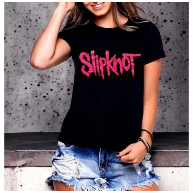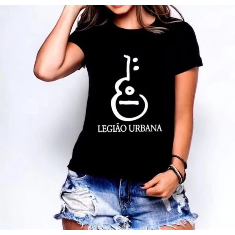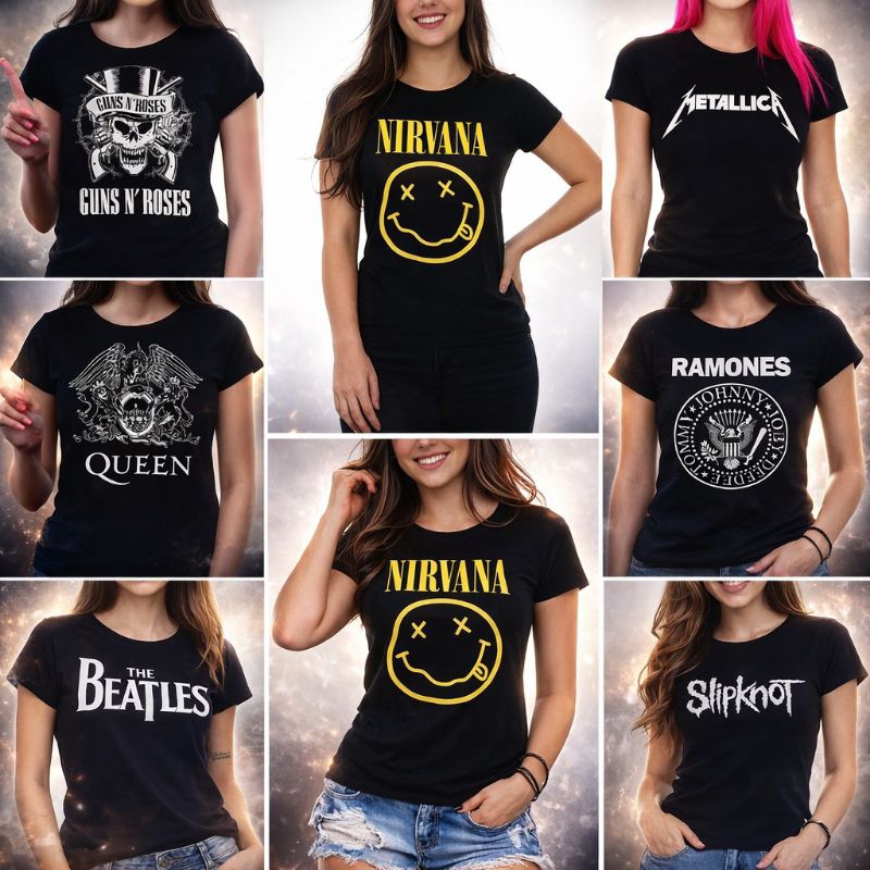Camiseta Baby look Feminina Preta Queen, Metálica, Beatles, Nirvana, Slipknot, Legião Urbana Banda Rock Clássicas